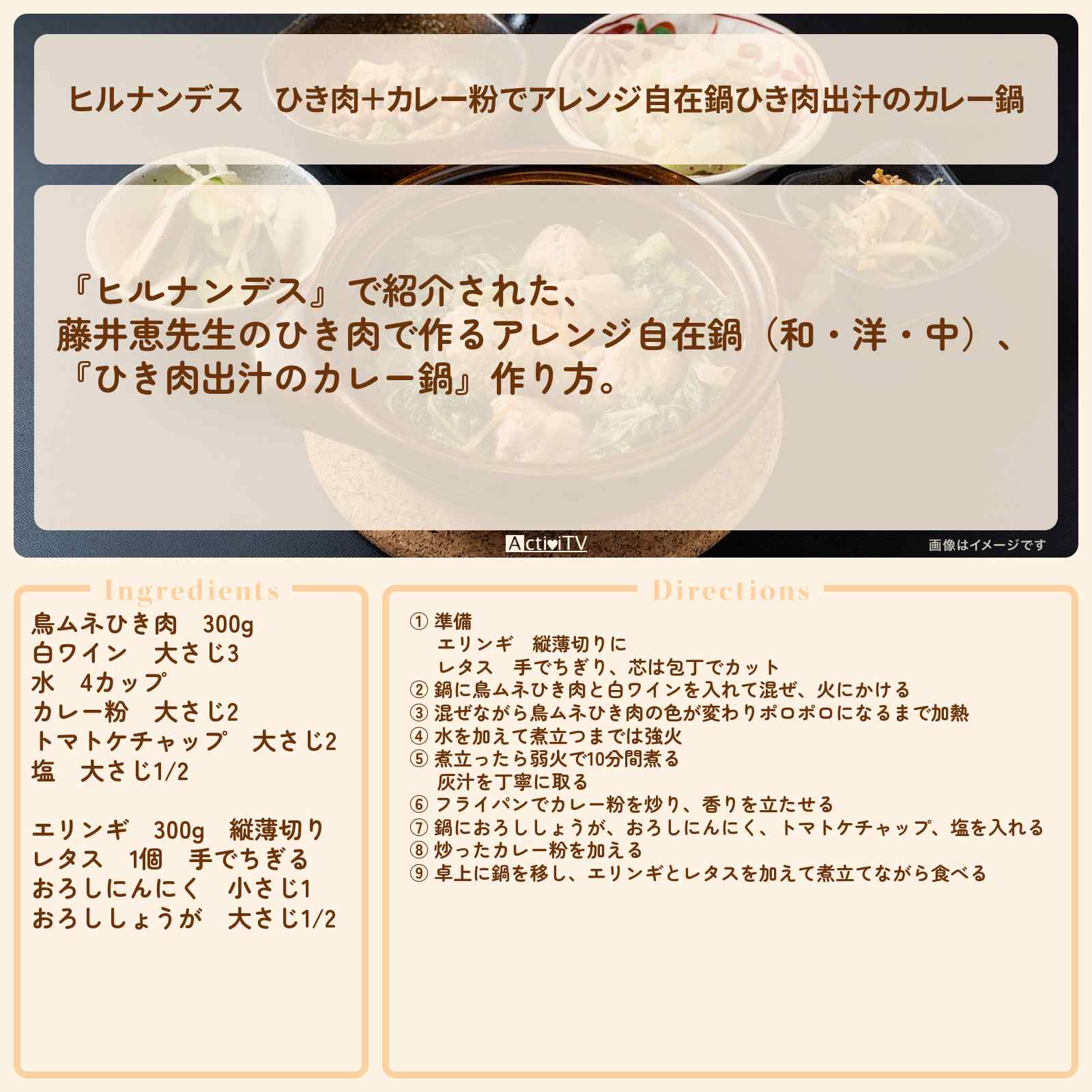 放送の【ヒルナンデス】で紹介された、藤井恵先生のひき肉で作るアレンジ自在鍋(和・洋・中)、『ひき肉出汁のカレー鍋』作り方。