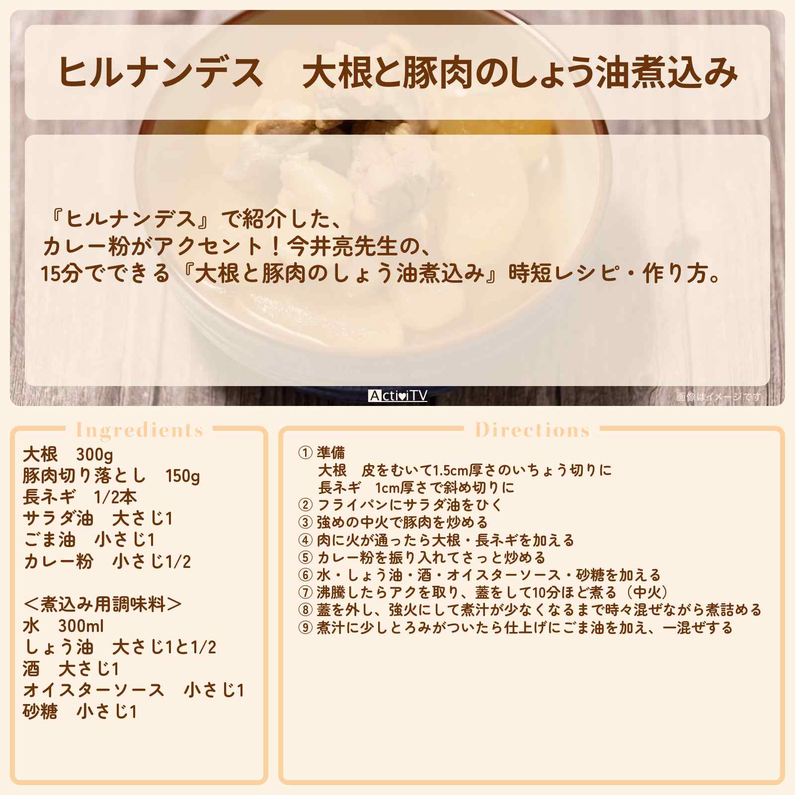 放送の【ヒルナンデス】で紹介した、カレー粉がアクセント!今井亮先生の、15分でできる『大根と豚肉のしょう油煮込み』時短レシピ・作り方。