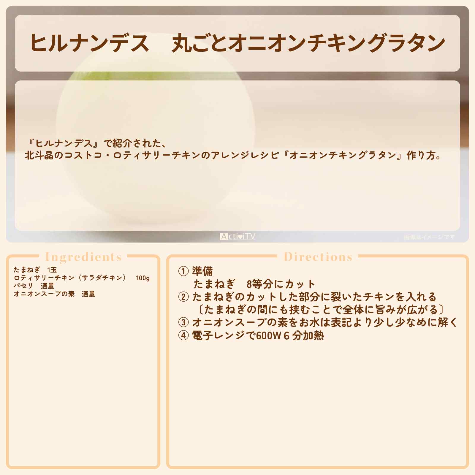 放送の【ヒルナンデス】で紹介された、北斗晶のコストコ・ロティサリーチキンのアレンジレシピ『オニオンチキングラタン』作り方。