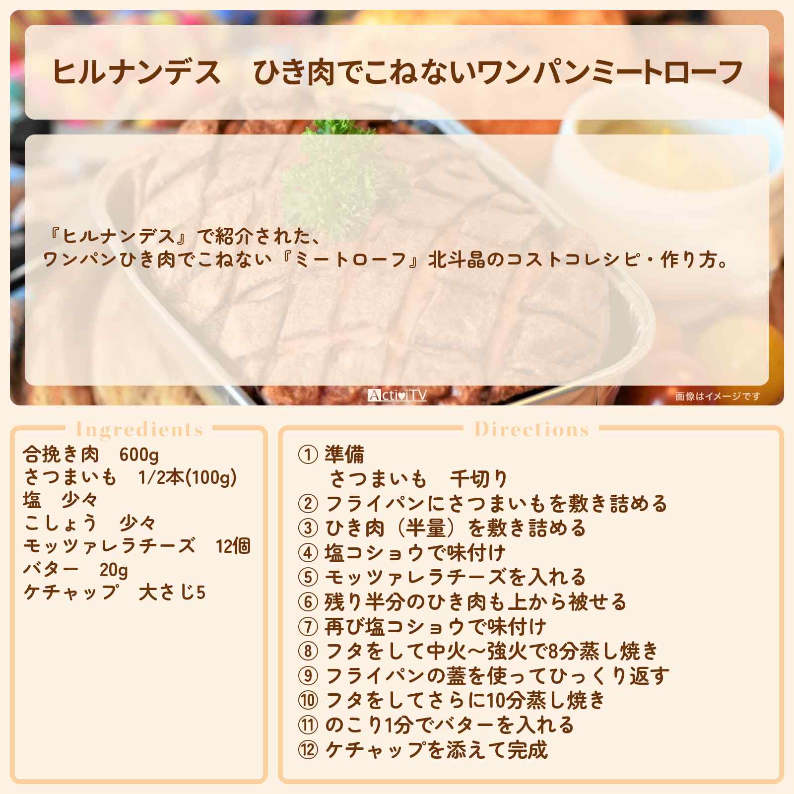 放送の【ヒルナンデス】で紹介された、ワンパンひき肉でこねない『ミートローフ』北斗晶のコストコレシピ・作り方。
