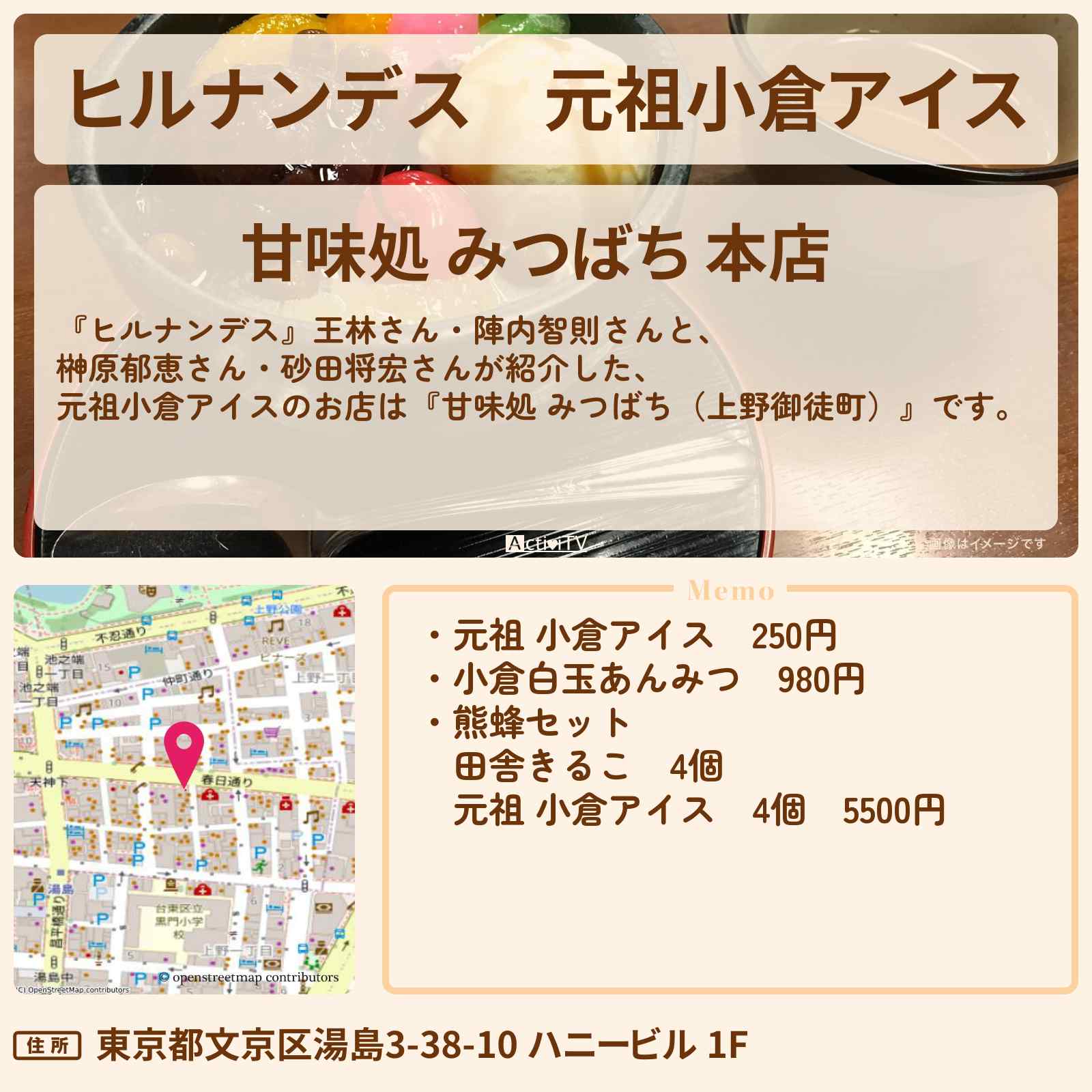 放送の【ヒルナンデス】王林さん・陣内智則さんと、榊原郁恵さん・砂田将宏さんが紹介した、元祖小倉アイスのお店は『甘味処 みつばち(上野御徒町)』です。
