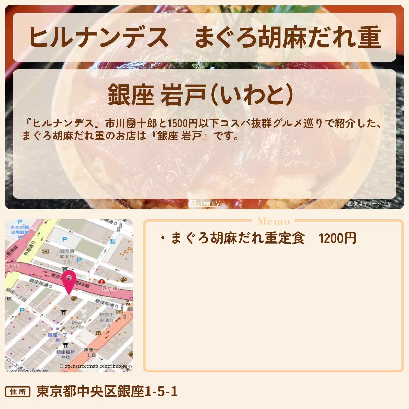 銀座 岩戸の名物料理は、まぐろ胡麻だれ重定食です。秘伝の濃厚な胡麻だれで和えた新鮮なマグロが、ご飯の上に敷き詰められています。