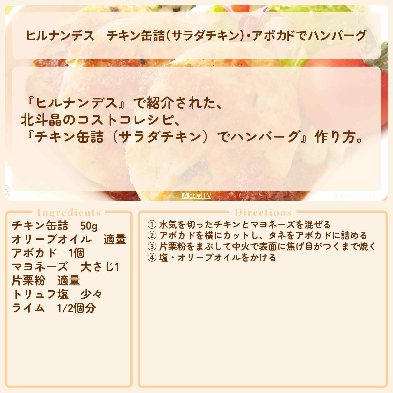 放送の【ヒルナンデス】で紹介された、北斗晶のコストコレシピ、『チキン缶詰(サラダチキン)でハンバーグ』作り方。
