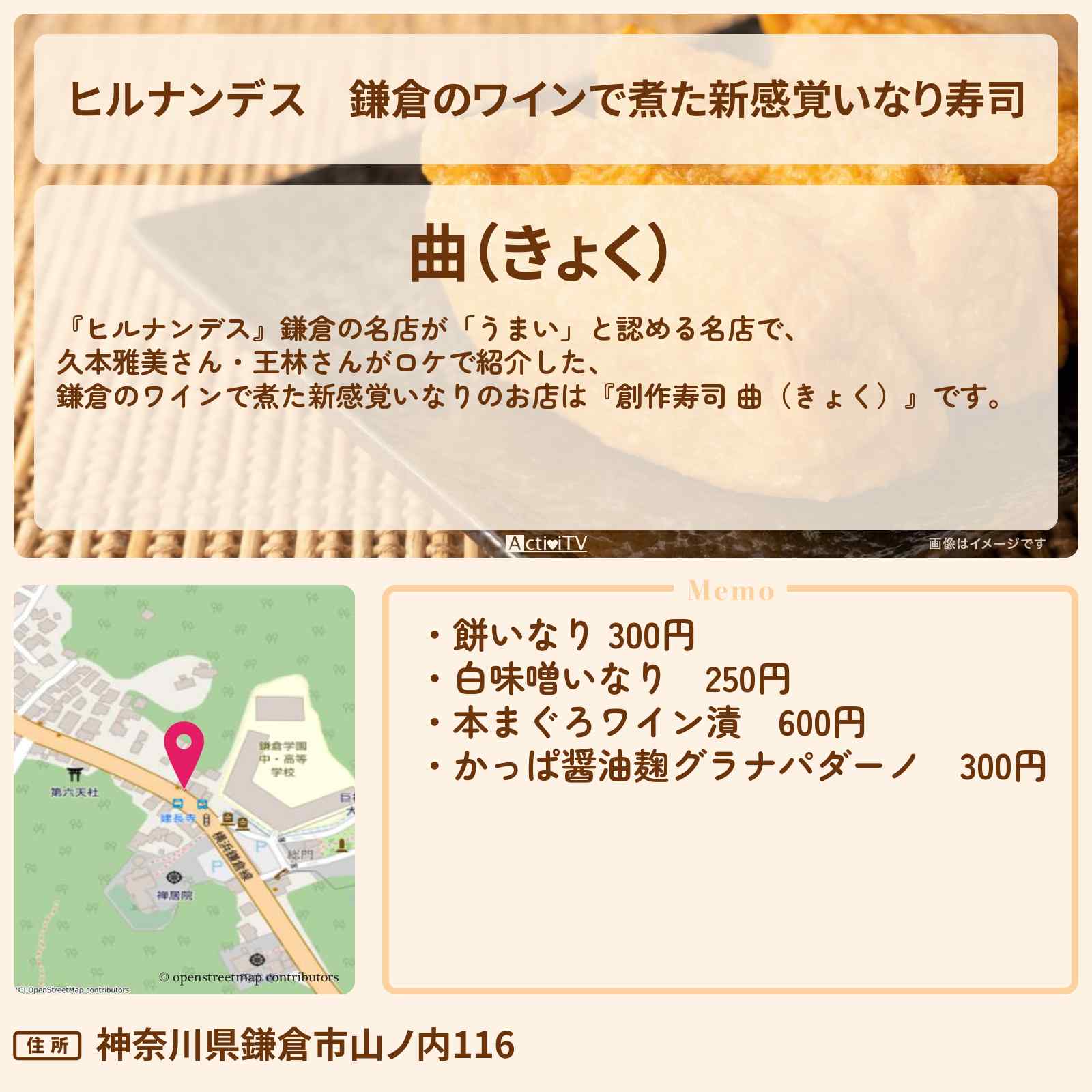 放送の【ヒルナンデス】鎌倉の名店が「うまい」と認める名店で、久本雅美さん・王林さんがロケで紹介した、鎌倉のワインで煮た新感覚いなりのお店は『創作寿司 曲(きょく)』です。