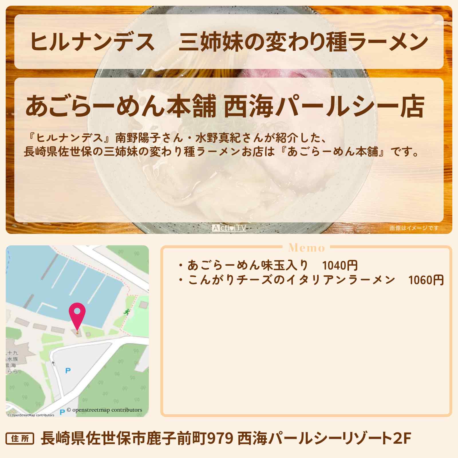 三姉妹の変わり種ラーメン 大学駅「あごらーめん本舗 西海パールシー店」