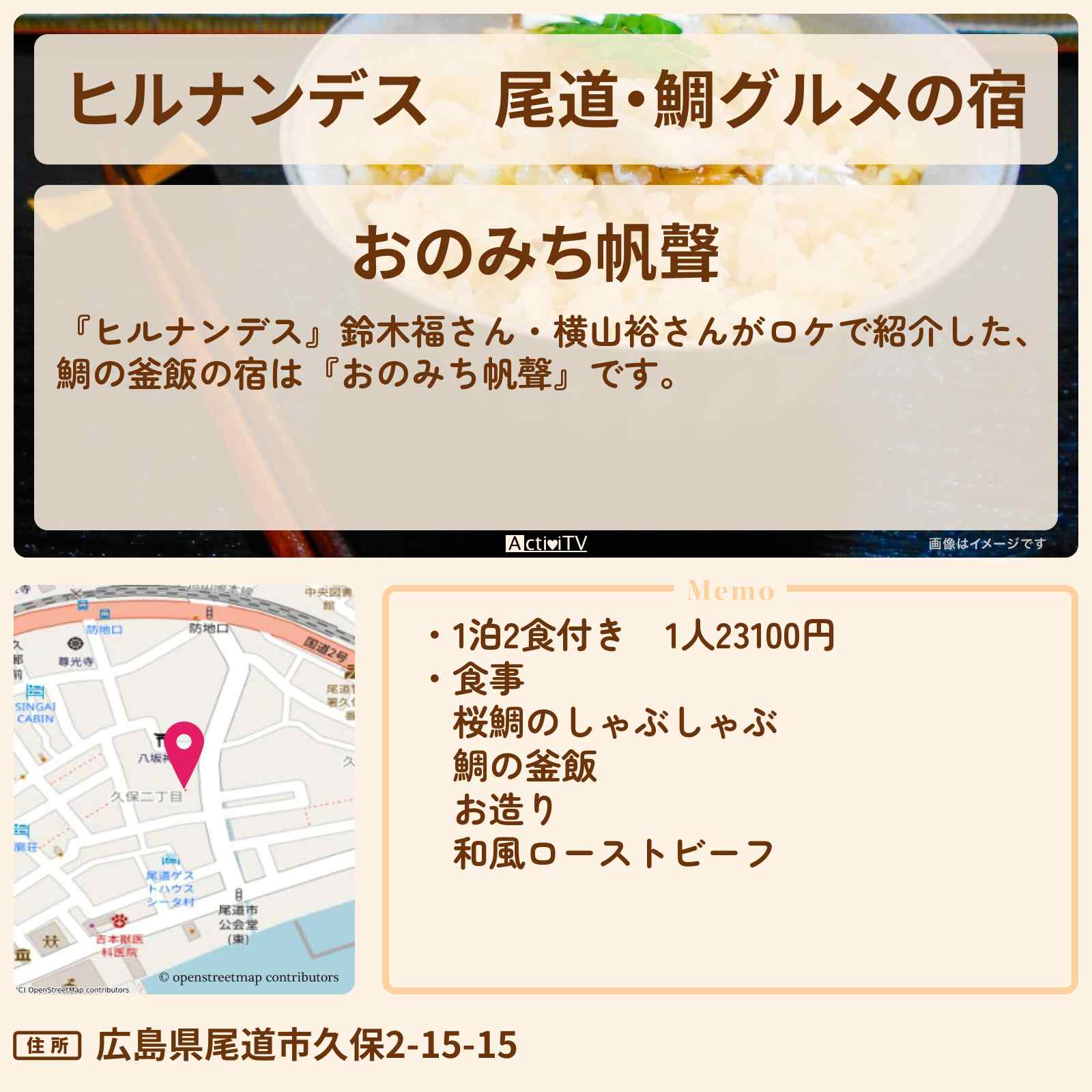 放送の【ヒルナンデス】鈴木福さん・横山裕さんがロケで紹介した、鯛の釜飯の宿は『おのみち帆聲』です。
