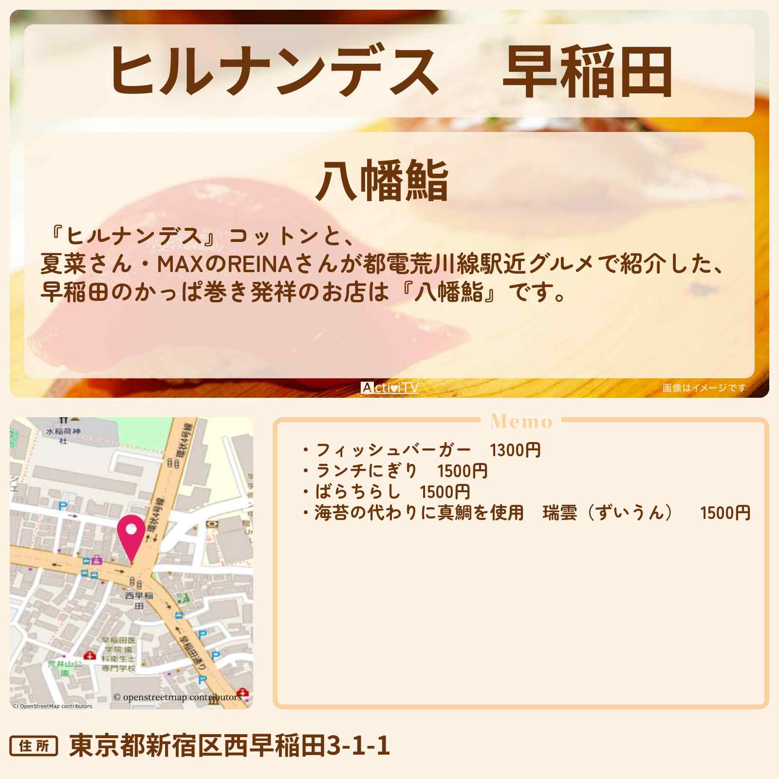 八幡鮨(早稲田/和食/寿司)の店舗情報・予約なら、お得なクーポン満載【ホットペッパーグルメ】!八幡鮨のおすすめポイントは、歴史あるお店です。長年たくさんの人達を笑顔にしてきました。 粋なご主人と話ながら1杯どうぞ。。八幡鮨の地図、メニュー、口コミ、写真などグルメ情報満載です!…