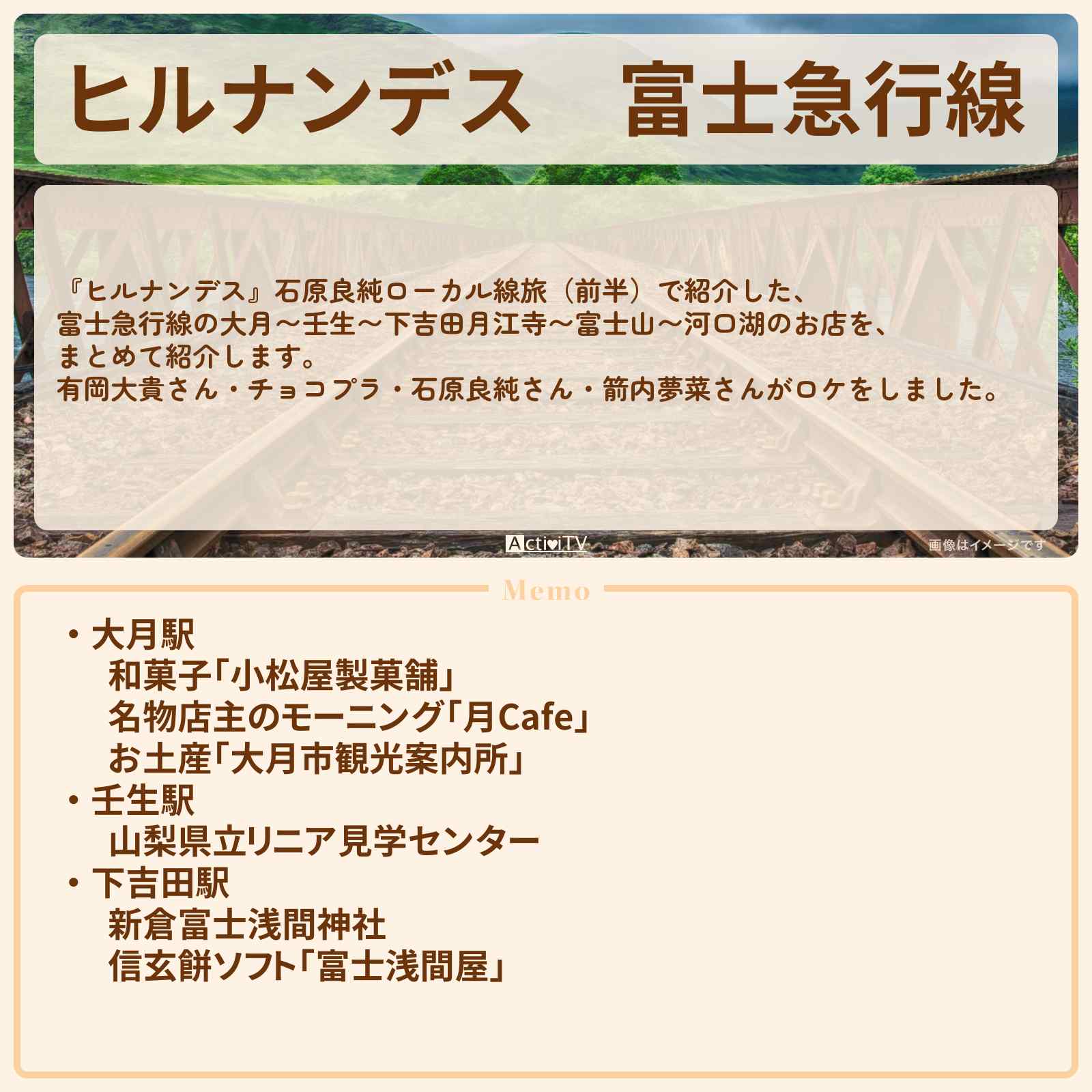 月江寺駅〜富士山駅〜河口湖駅の情報は放送次第追記します。