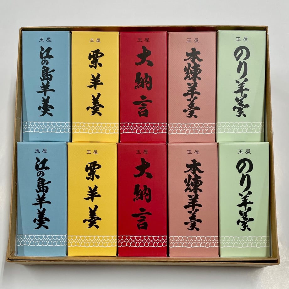 当店は明治四十五年、江ノ島電鉄、通称江ノ電の開通と同時に開業いたしました。江ノ島詣でのお土産として作られ、特にのり羊羹は当時江ノ島で漁れました青のりを粉にしたものを白餡にねりこみ、磯の香り豊かな珍しい一品でございます。他に栗が丸のまま入りました栗羊羹、大納言等もございます。