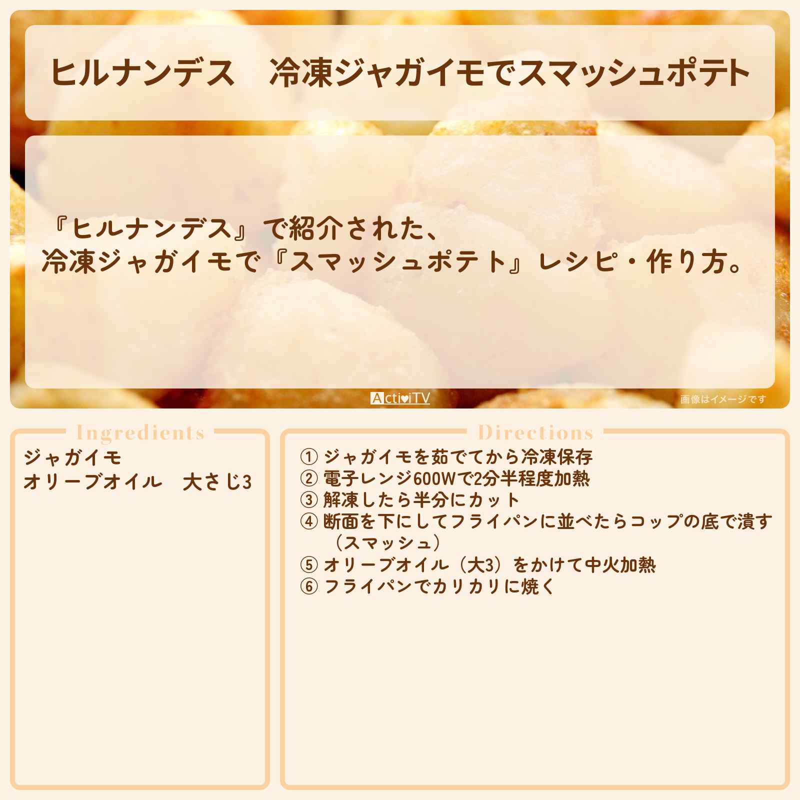 放送の【ヒルナンデス】で紹介された、冷凍ジャガイモで『スマッシュポテト』レシピ・作り方。