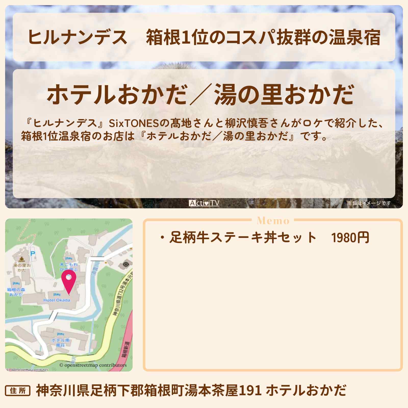 | 住所 | 神奈川県足柄下郡箱根町湯本茶屋191 ホテルおかだ |