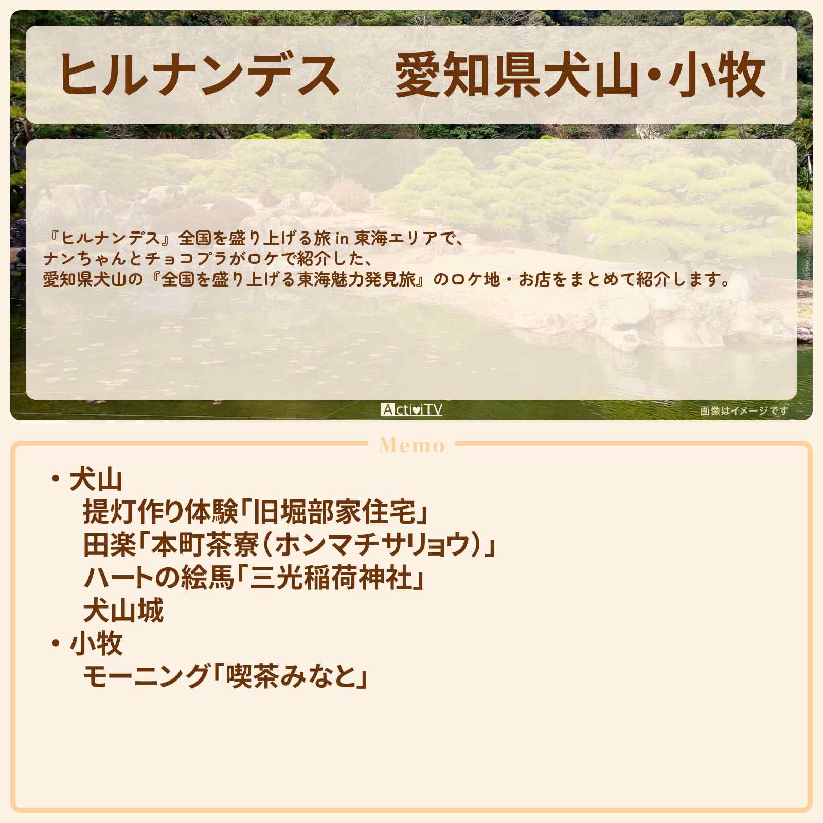 犬山のご当地名物の田楽や、日本最古の天守の犬山城、小牧ではモーニングの喫茶みなとなどを巡りました。