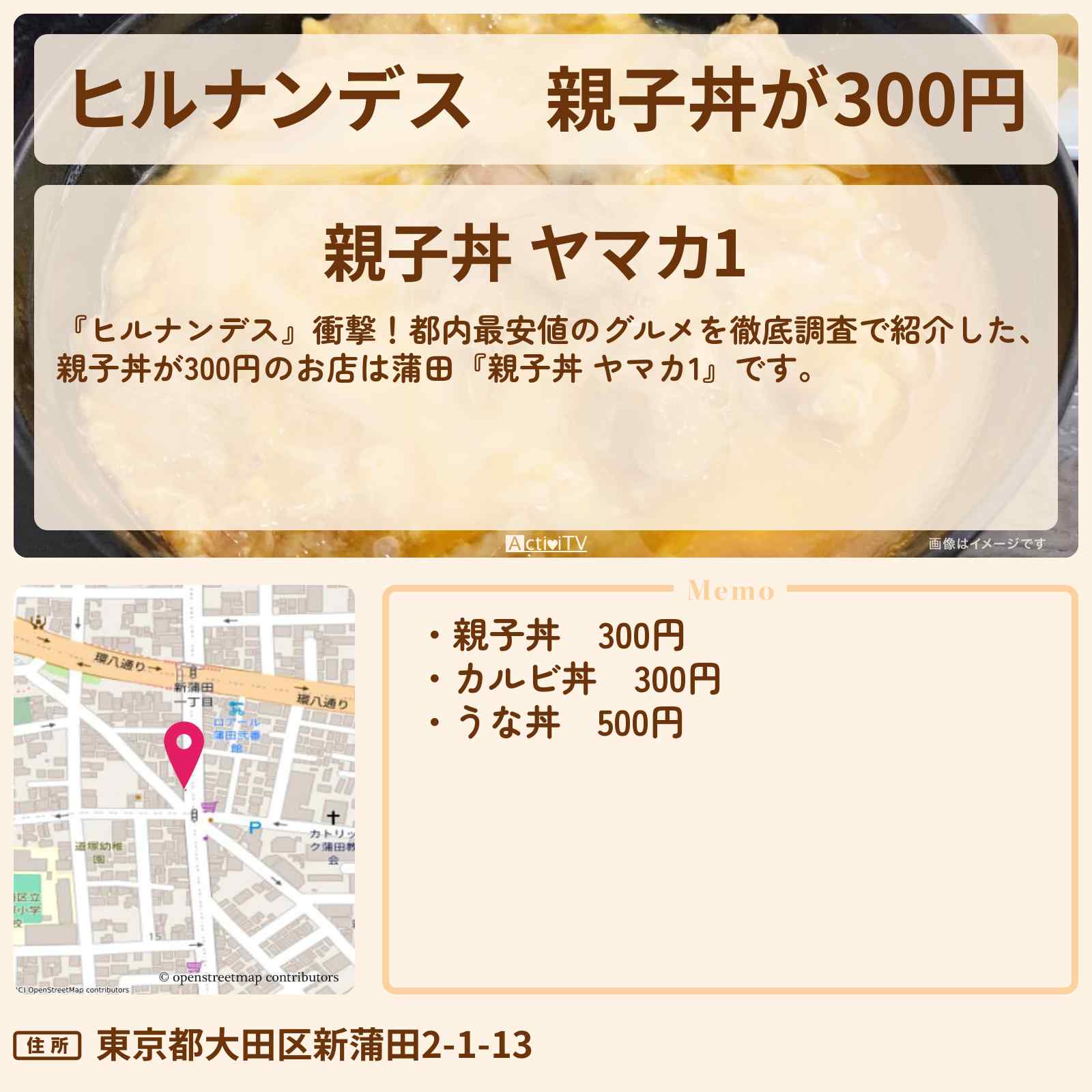 お腹がすいてはいくさはできぬ。親子丼ヤマカ1は大田区蒲田にお店をかまえ、格安でおいしい親子丼を始め食事を提供しています。「大田区の食生活を支えたい」をコンセプトにお店を営んでいます。…