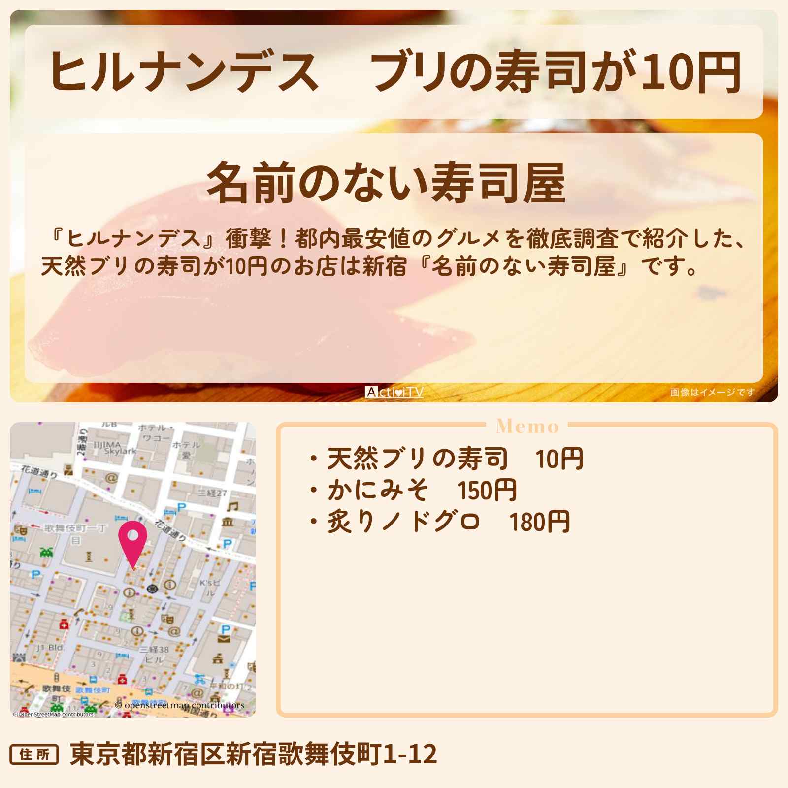放送の【ヒルナンデス】衝撃!都内最安値のグルメを徹底調査で紹介した、天然ブリの寿司が10円のお店は新宿『名前のない寿司屋』です。