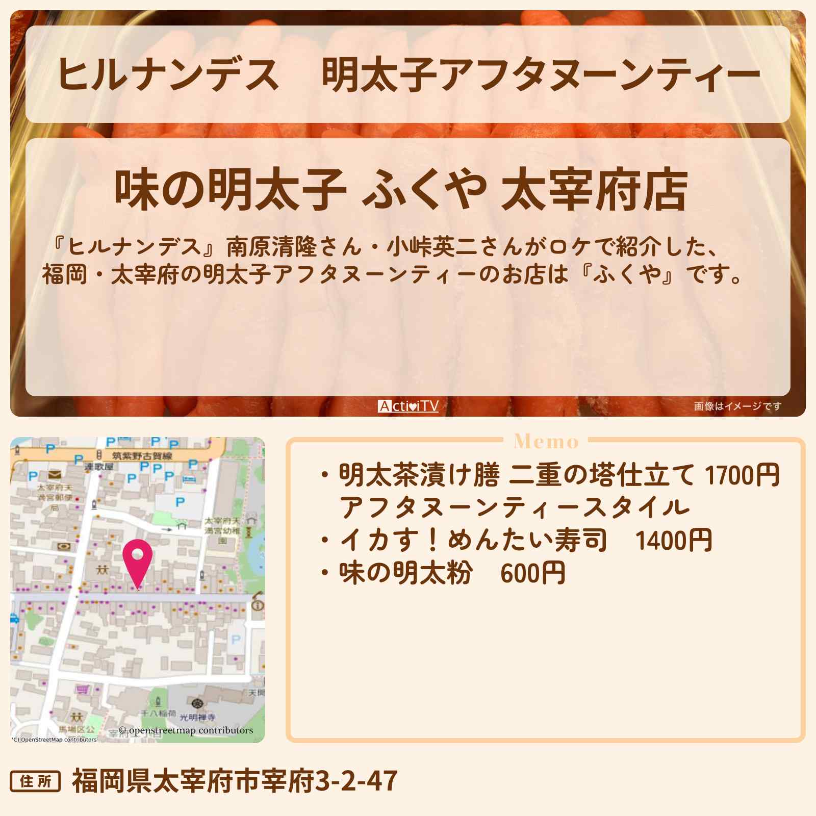 放送の【ヒルナンデス】南原清隆さん・小峠英二さんがロケで紹介した、福岡・太宰府の明太子アフタヌーンティーのお店は『ふくや』です。
