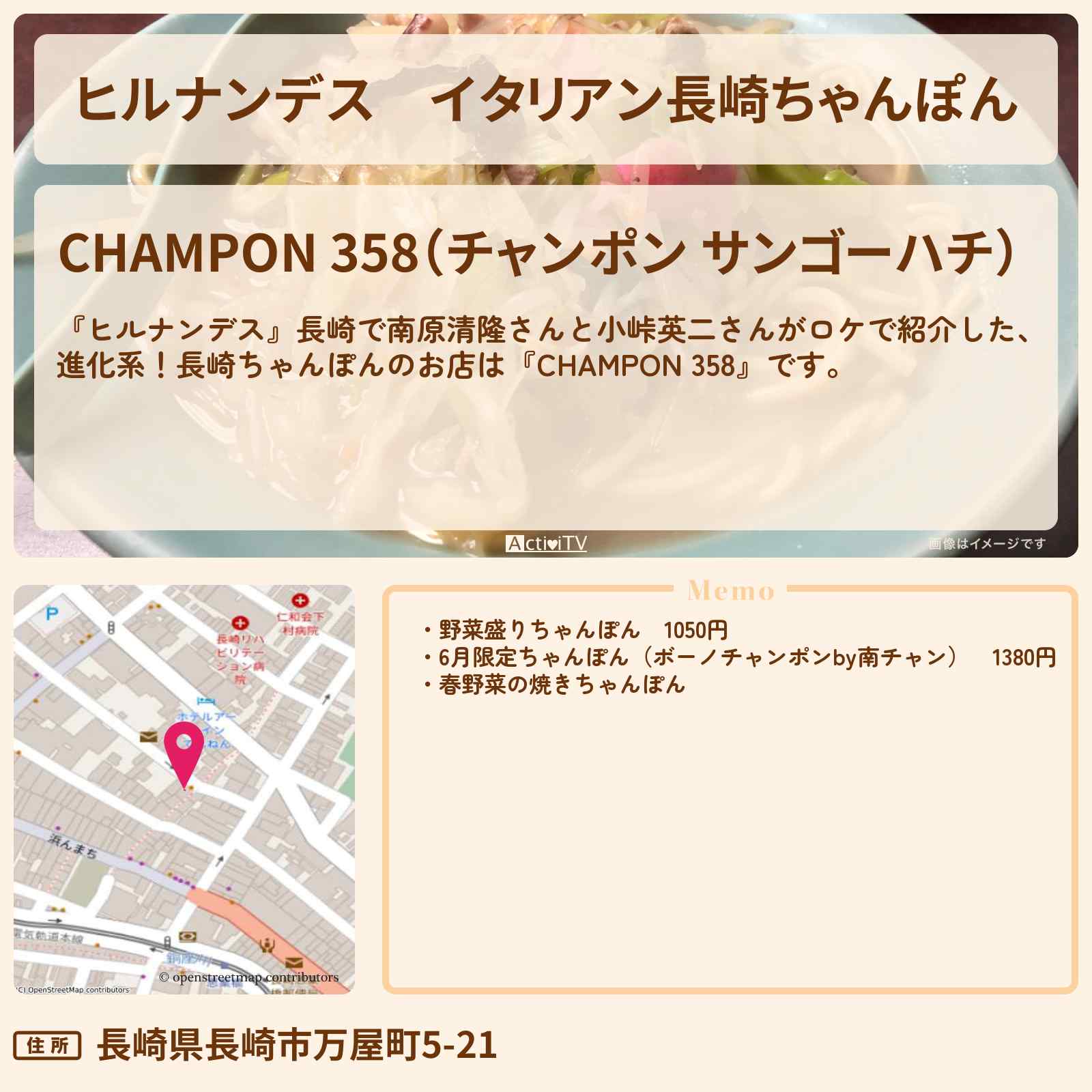 こちらは『CHAMPON 358(長崎市)』のお店ページです。実名でのオススメが1件集まっています。Rettyで食が好きなグルメな人たちからお店を探そう!