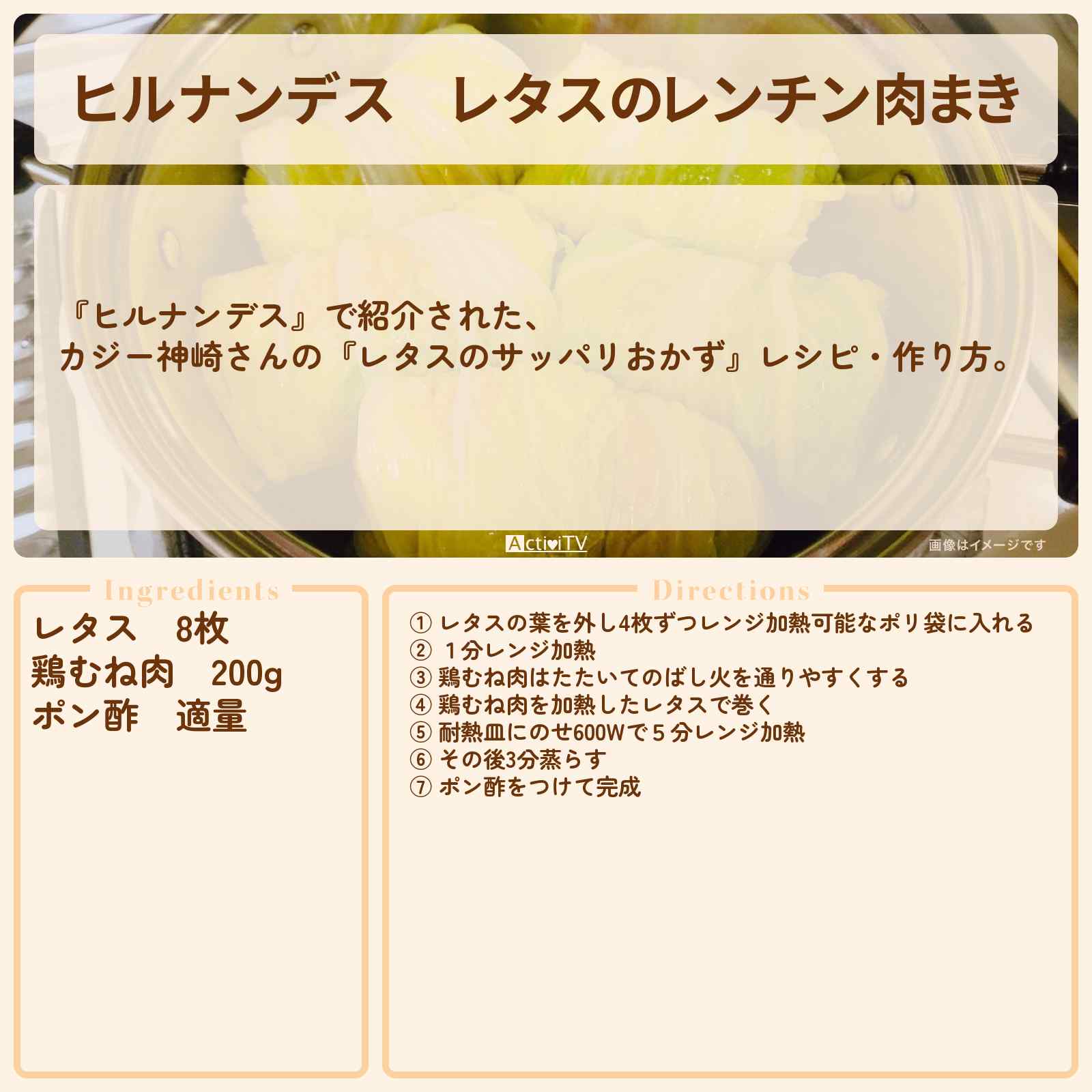 放送の【ヒルナンデス】で紹介された、カジー神崎さんの『レタスのサッパリおかず』レシピ・作り方。