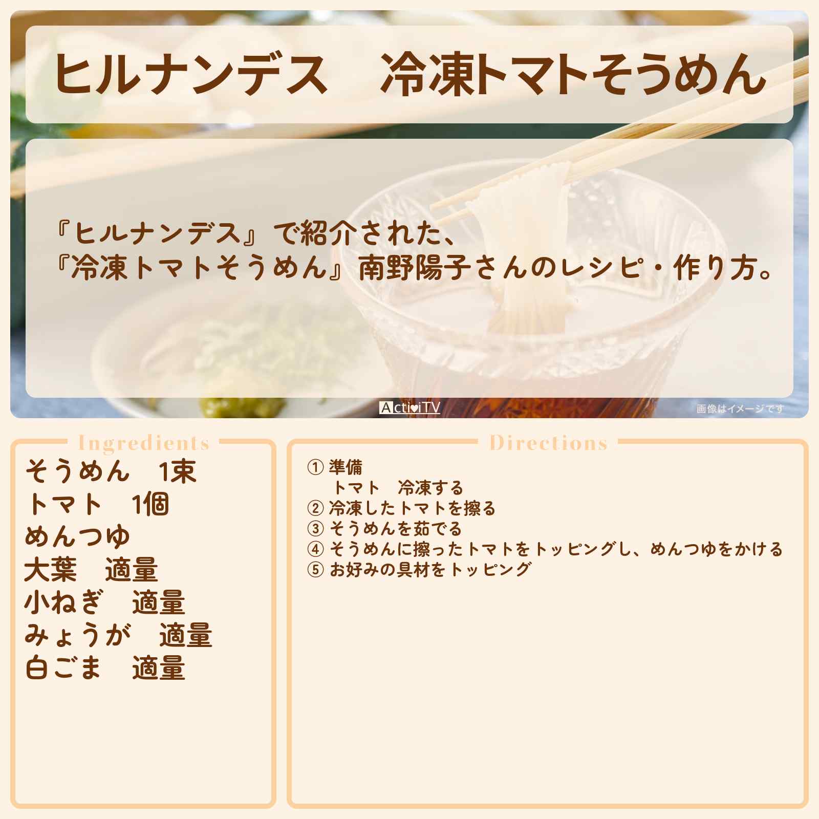 放送の【ヒルナンデス】で紹介された、『冷凍トマトそうめん』南野陽子さんのレシピ・作り方。