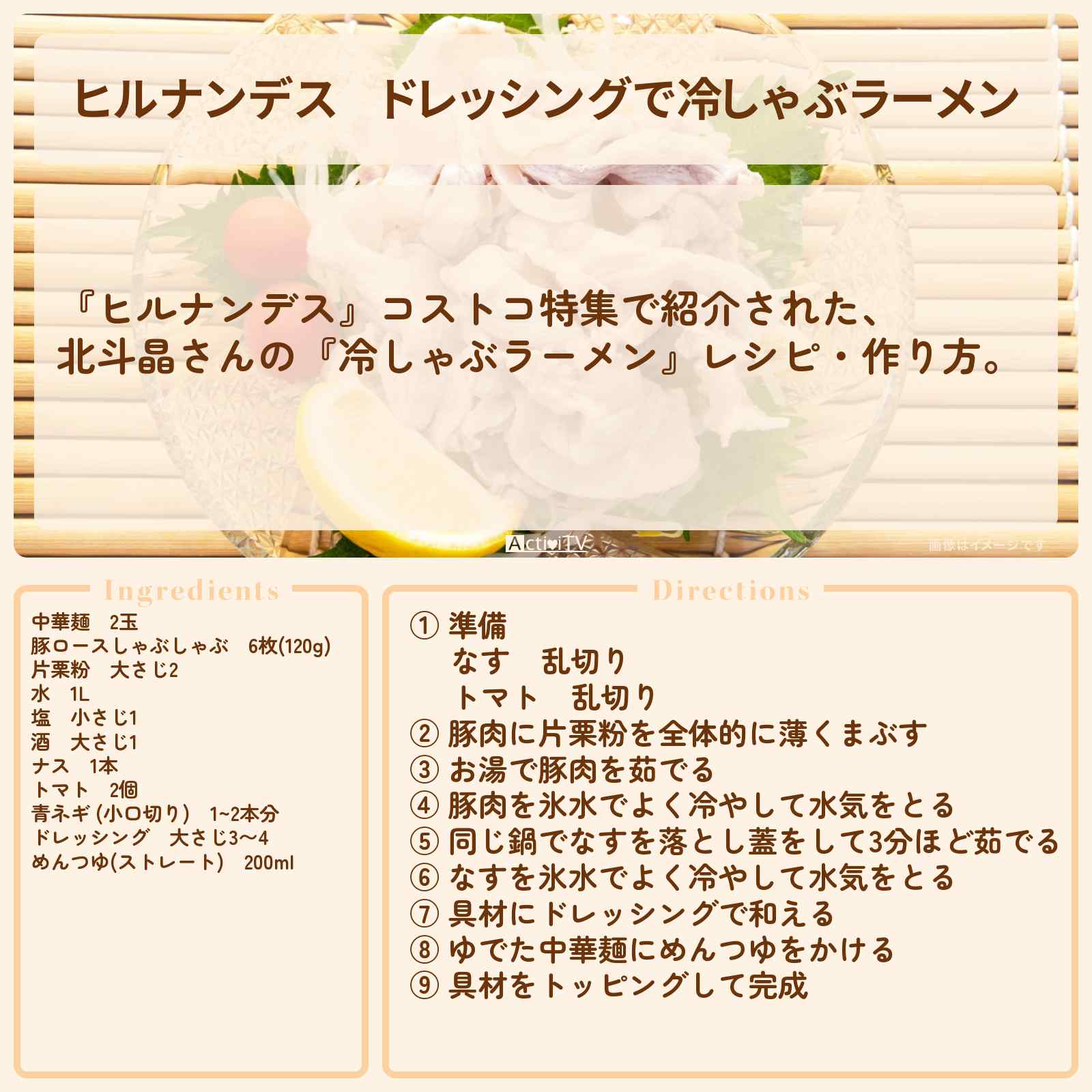 放送の【ヒルナンデス】コストコ特集で紹介された、北斗晶さんの『冷しゃぶラーメン』レシピ・作り方。