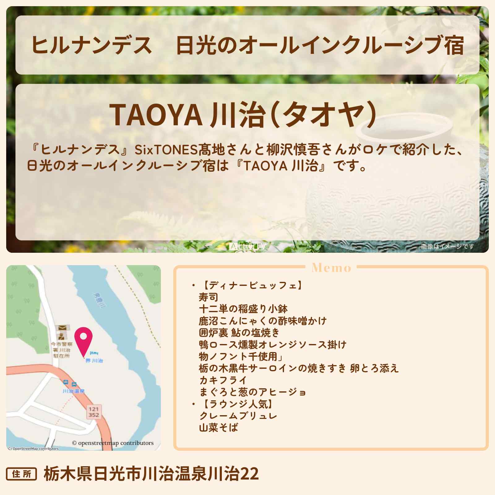 【ヒルナンデス】日光のオールインクルーシブ宿『TAOYA 川治』宿泊・予約方法を紹介〔髙地優吾・SixTONES・柳沢慎吾〕