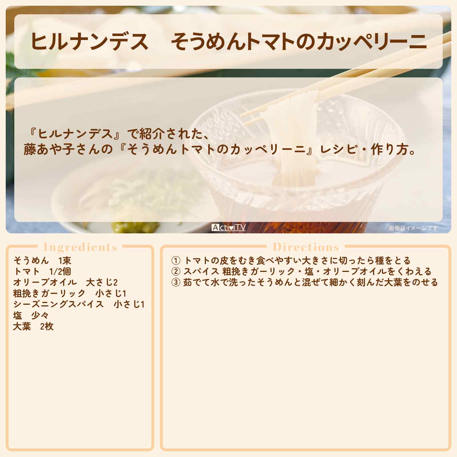 放送の【ヒルナンデス】で紹介された、藤あや子さんの『そうめんトマトのカッペリーニ』レシピ・作り方。