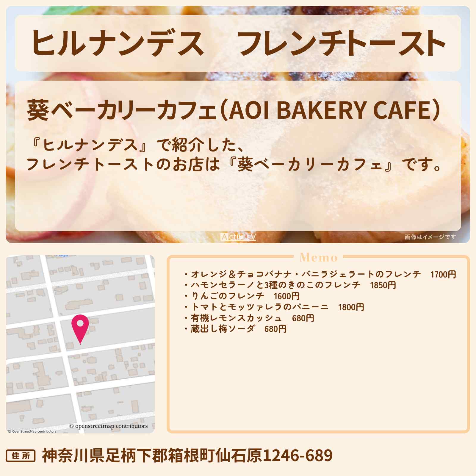 放送の【ヒルナンデス】で紹介した、フレンチトーストのお店は『葵ベーカリーカフェ』です。