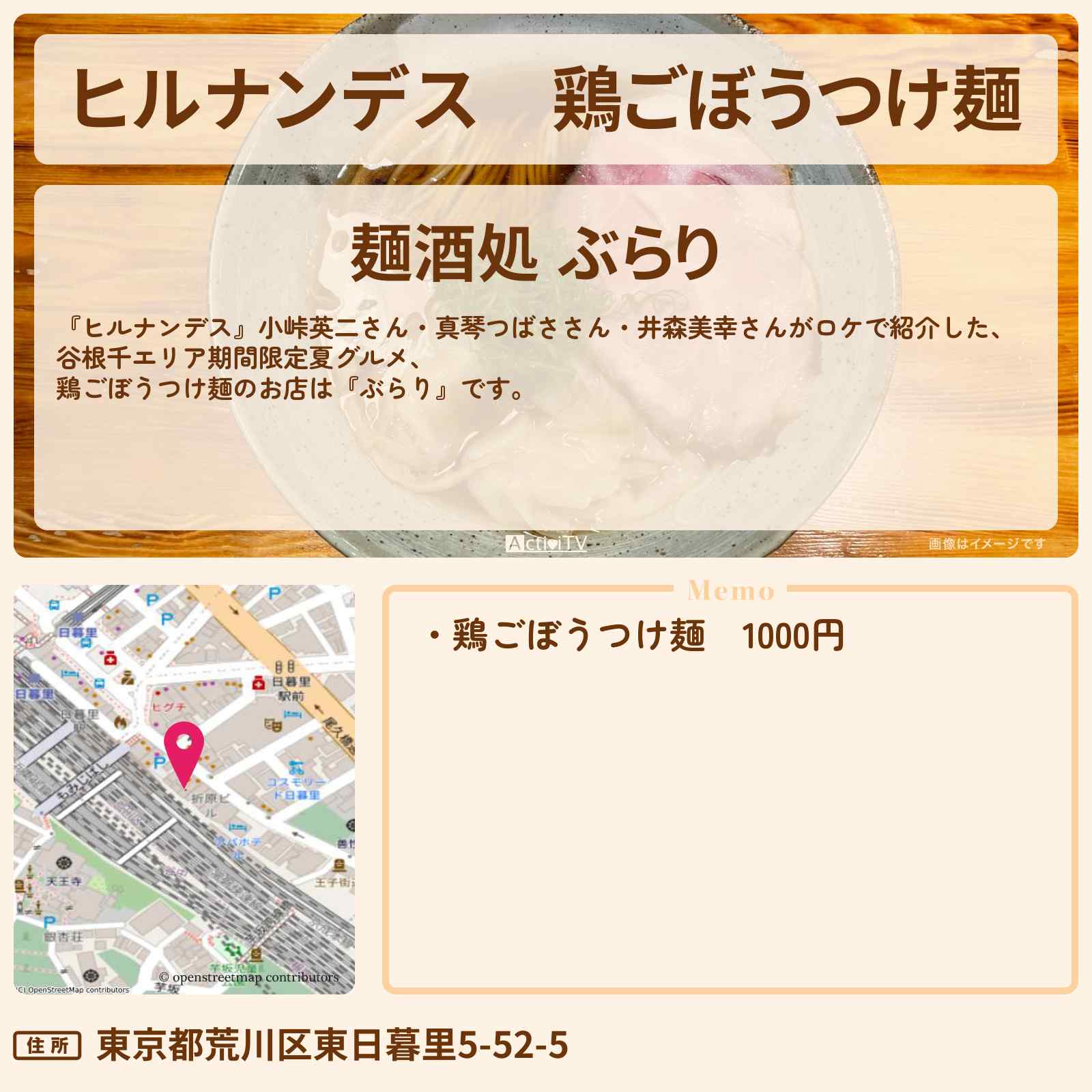 放送の【ヒルナンデス】小峠英二さん・真琴つばささん・井森美幸さんがロケで紹介した、谷根千エリア期間限定夏グルメ、鶏ごぼうつけ麺のお店は『ぶらり』です。