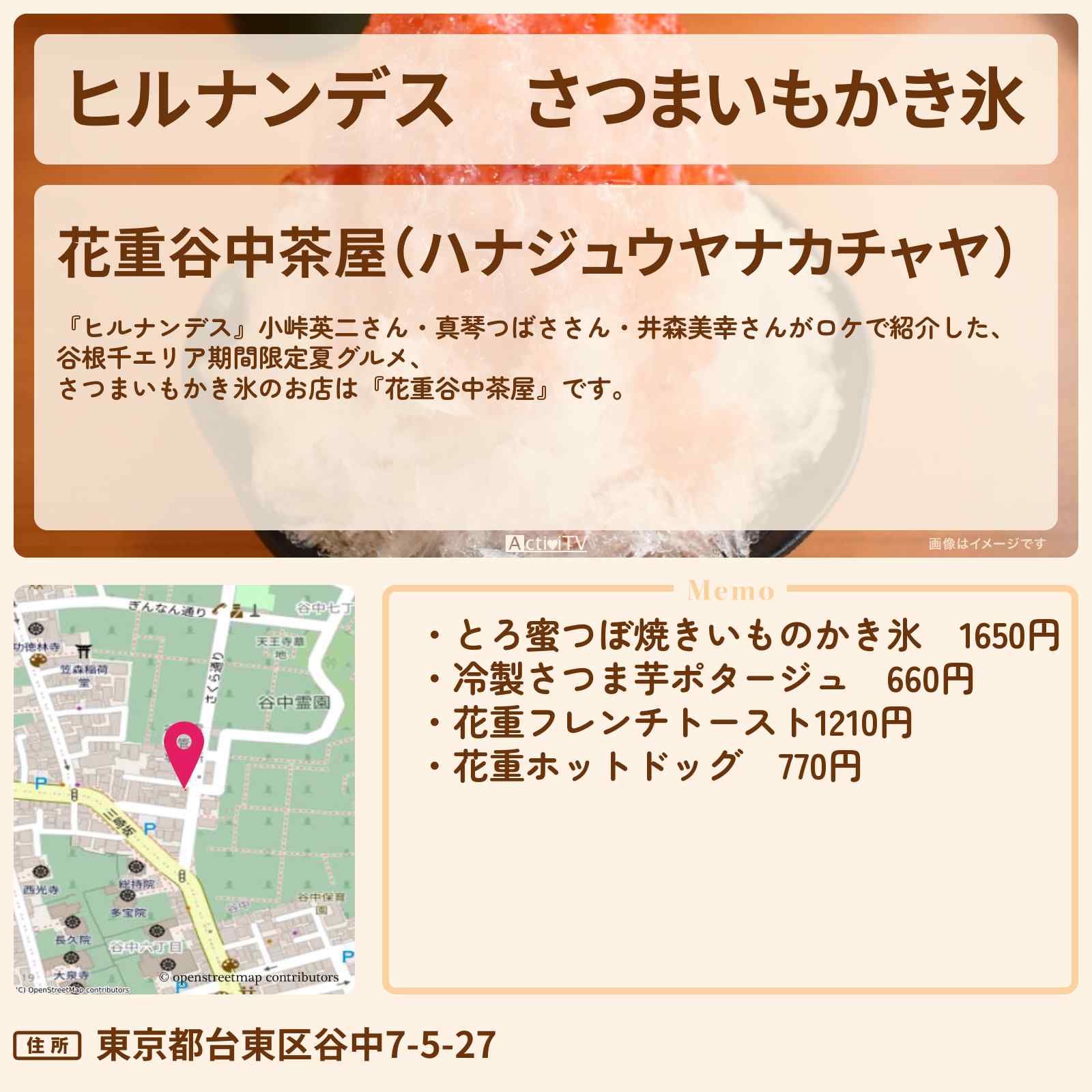 さつまいもかき氷 日暮里駅「花重谷中茶屋(ハナジュウヤナカチャヤ)」