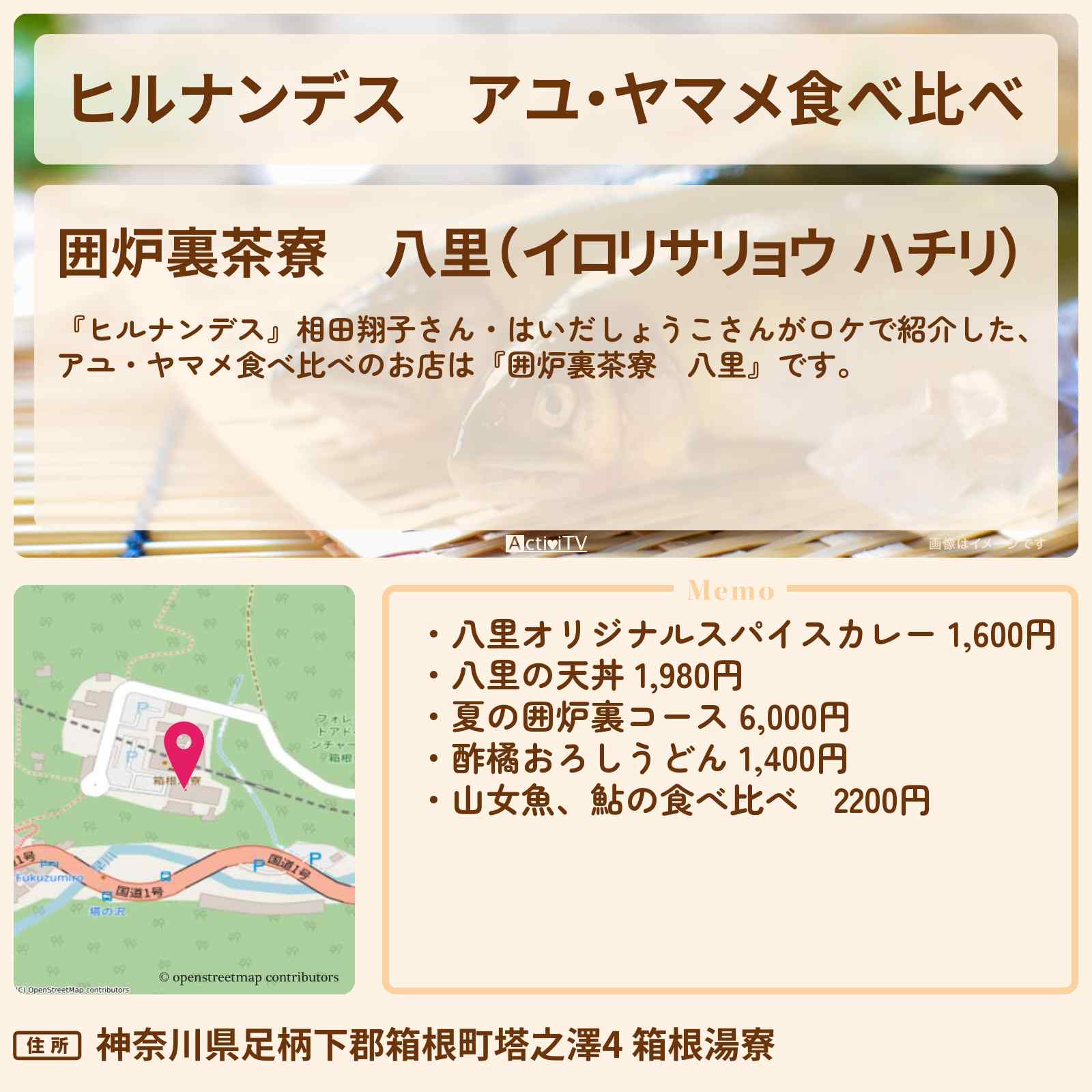 放送の【ヒルナンデス】相田翔子さん・はいだしょうこさんがロケで紹介した、アユ・ヤマメ食べ比べのお店は『囲炉裏茶寮 八里』です。