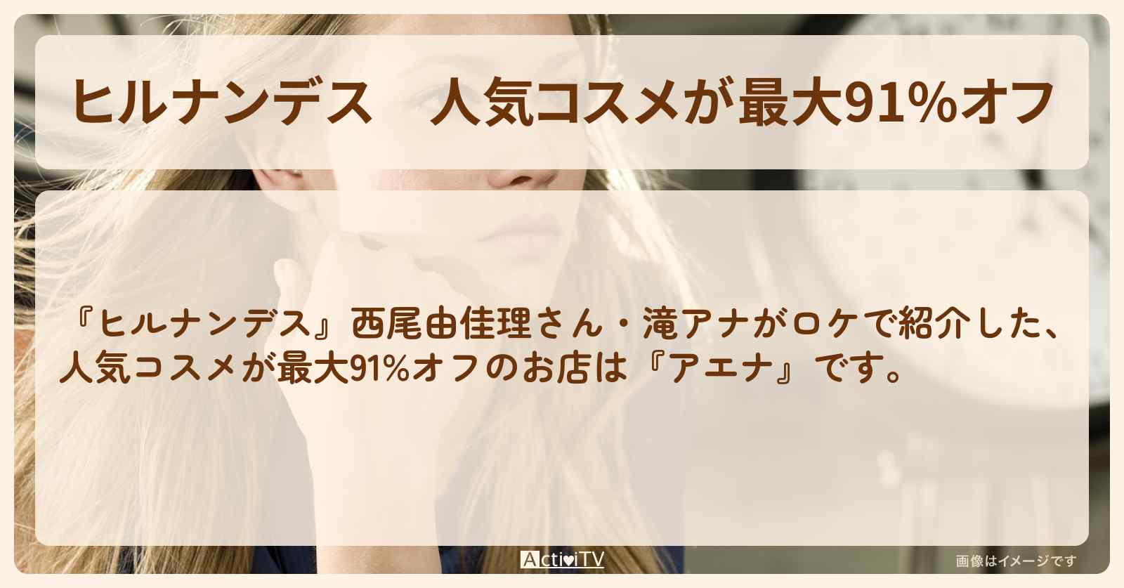 放送の【ヒルナンデス】西尾由佳理さん・滝アナがロケで紹介した、人気コスメが最大91%オフのお店は『アエナ』です。