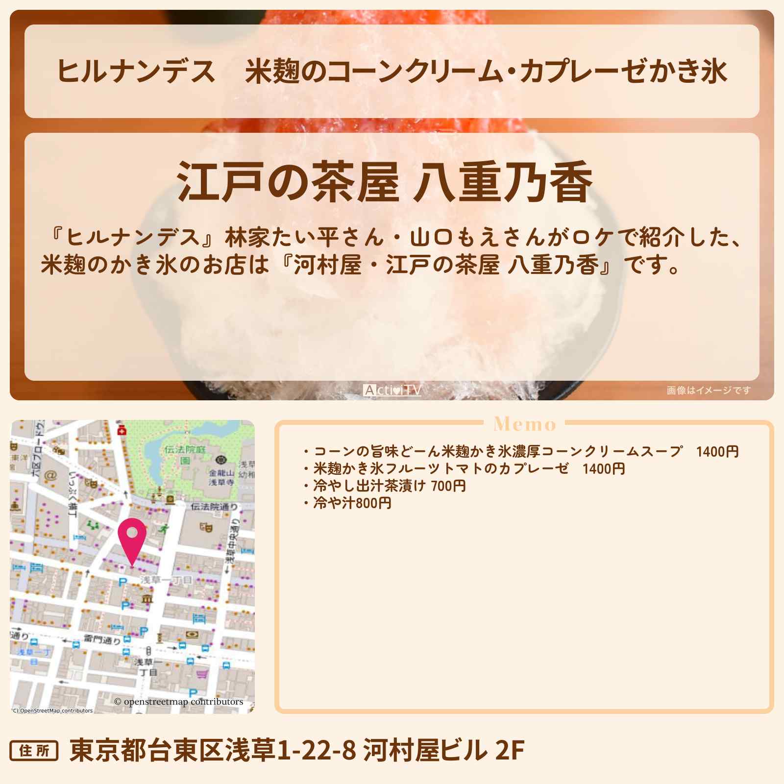 放送の【ヒルナンデス】林家たい平さん・山口もえさんがロケで紹介した、米麹のかき氷のお店は『河村屋・江戸の茶屋 八重乃香』です。