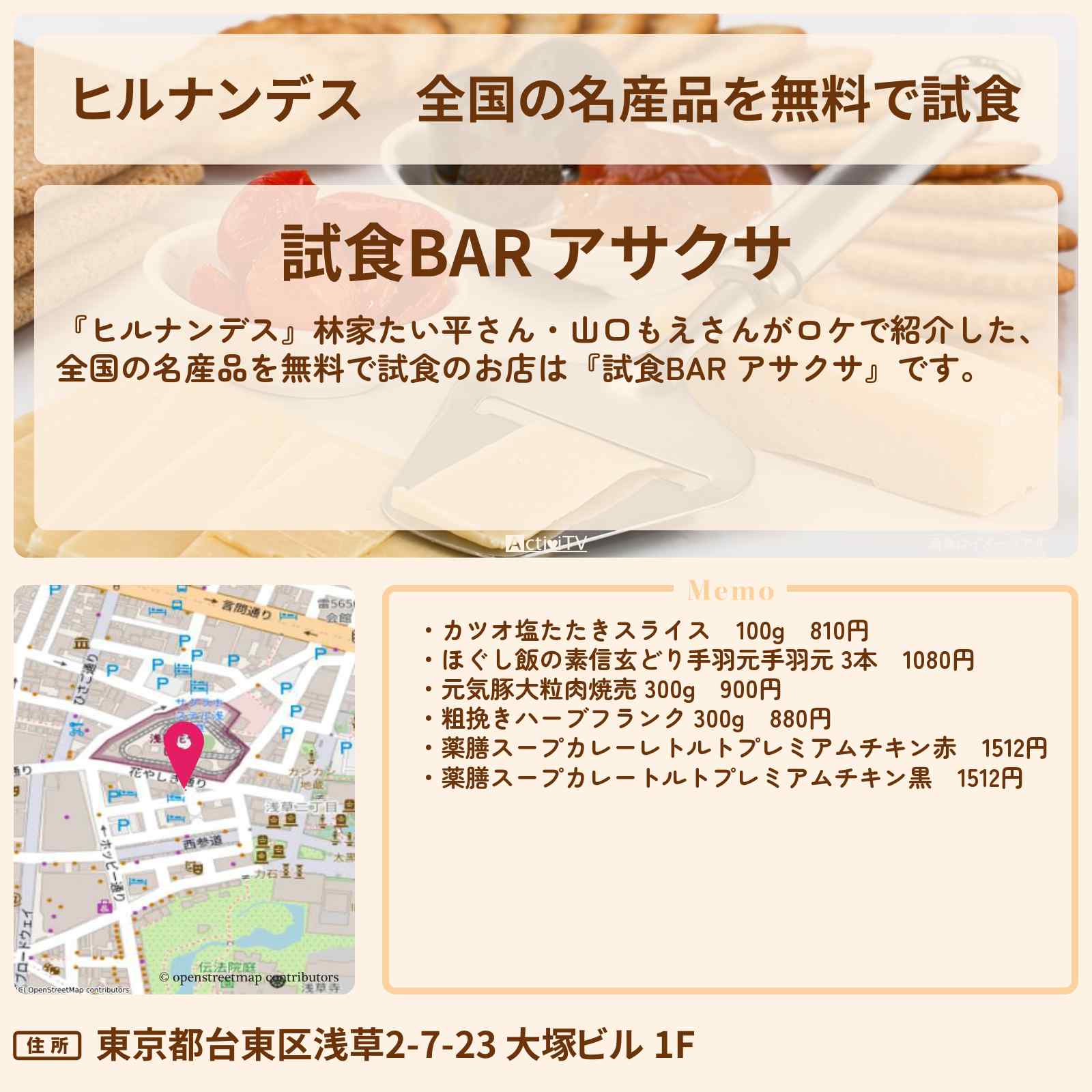 試食BARアサクサは、日本の宝・力である「食」を作り届ける事業者の想いと、消費者を繋ぐための架け橋となるべくスタートしたお店です。全国各地の特産物・名産品などを『試食』という形でお召し上がりいただけま……