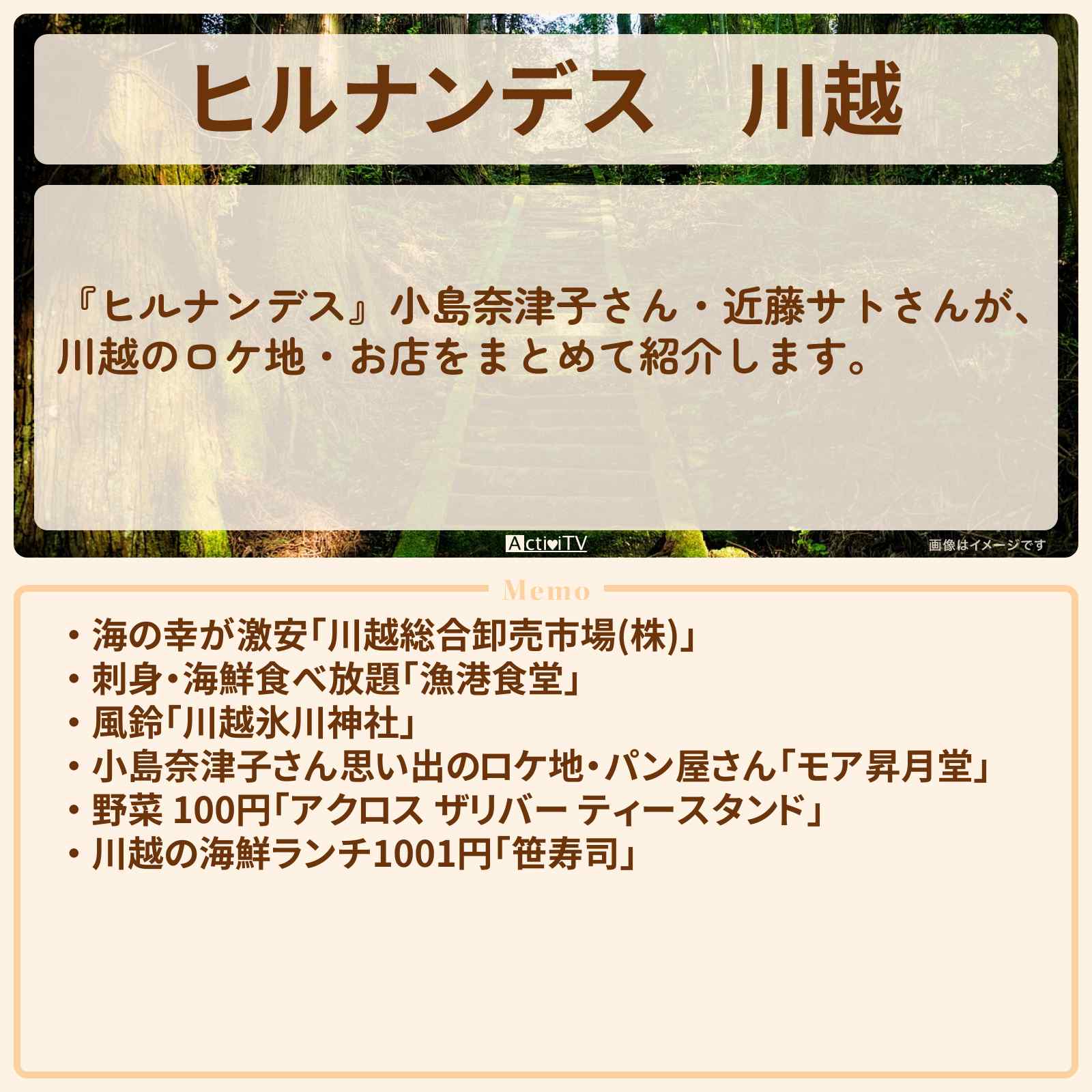 放送の【ヒルナンデス】小島奈津子さん・近藤サトさんが、川越のロケ地・お店をまとめて紹介します。