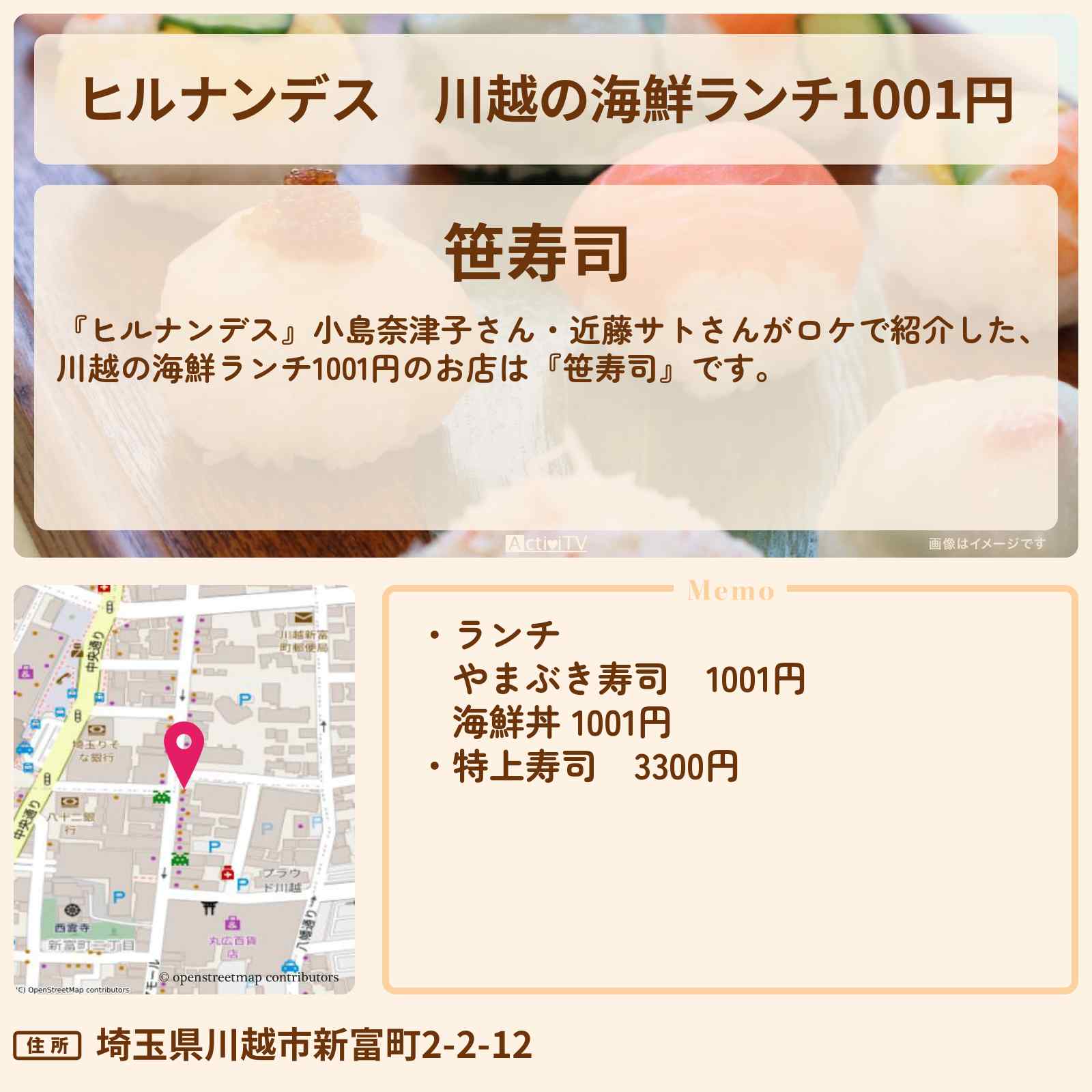放送の【ヒルナンデス】小島奈津子さん・近藤サトさんがロケで紹介した、川越の海鮮ランチ1001円のお店は『笹寿司』です。