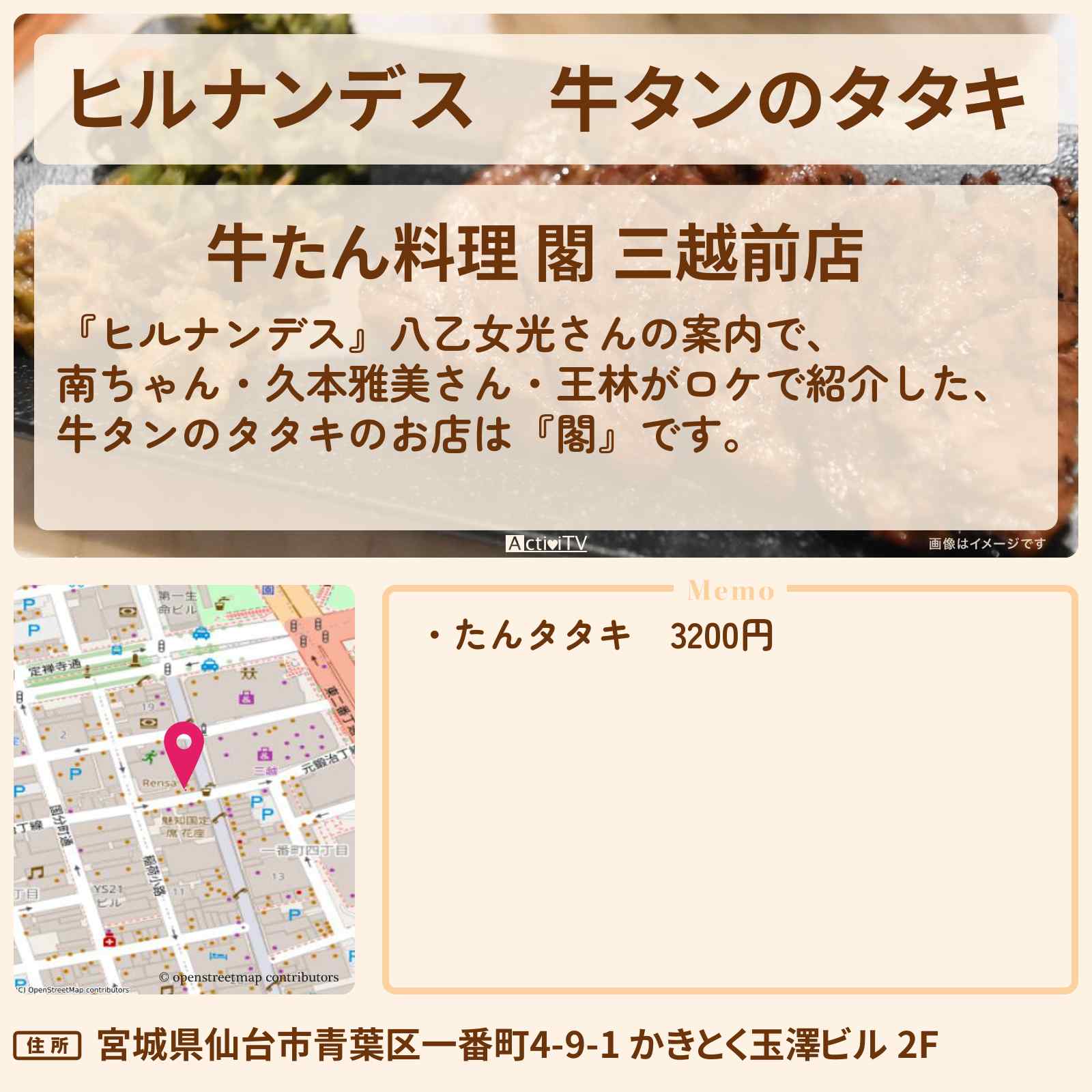 | 住所 | 宮城県仙台市青葉区一番町4-9-1 かきとく玉澤ビル 2F |