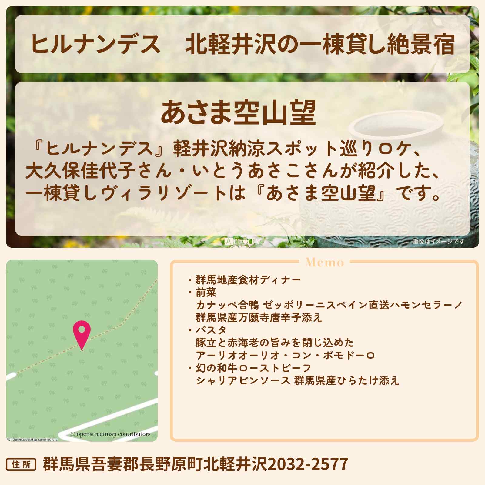 | 住所 | 群馬県吾妻郡長野原町北軽井沢2032-2577 |