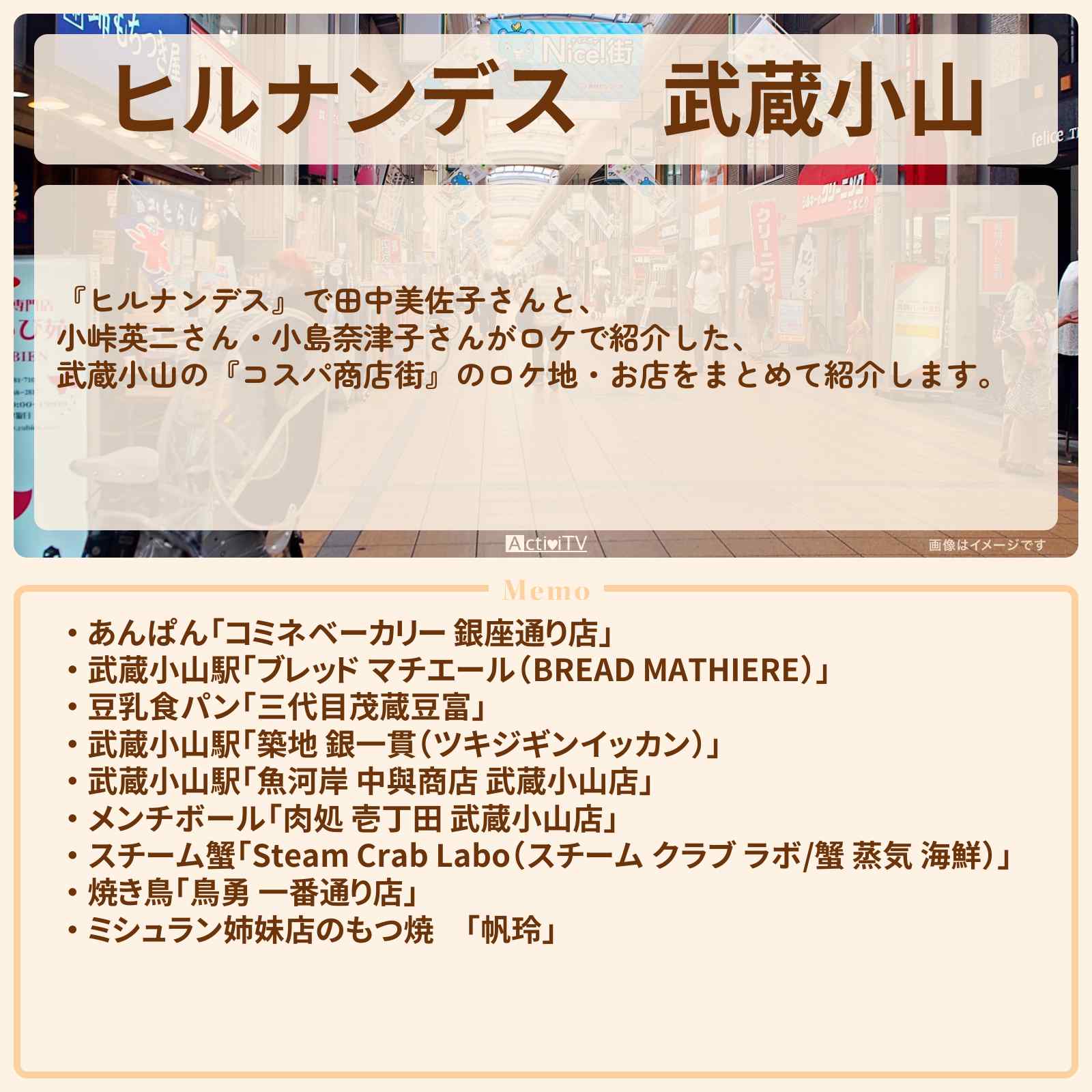 放送の【ヒルナンデス】で田中美佐子さんと、小峠英二さん・小島奈津子さんがロケで紹介した、武蔵小山の『コスパ商店街』のロケ地・お店をまとめて紹介します。
