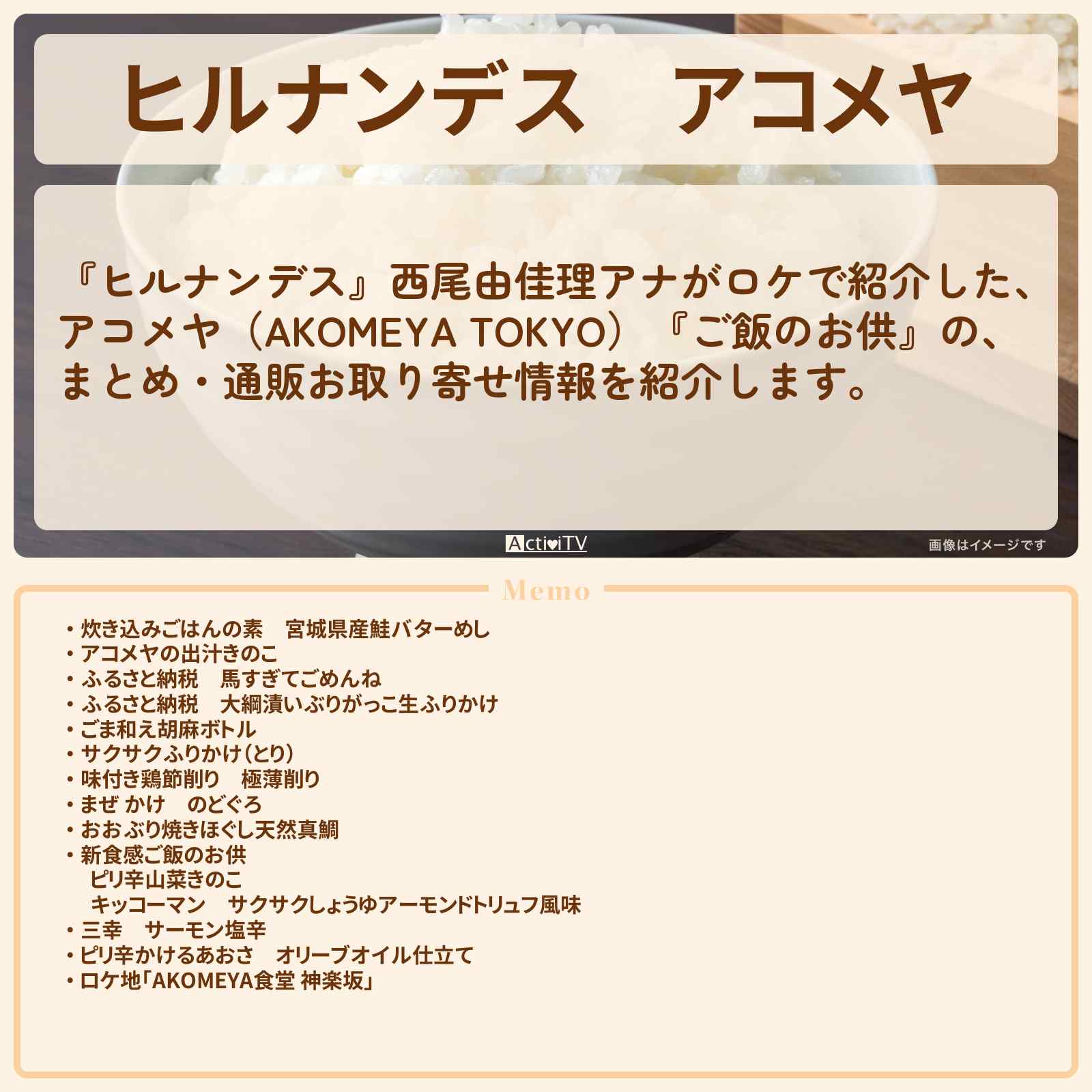 放送の【ヒルナンデス】西尾由佳理アナがロケで紹介した、アコメヤ(AKOMEYA TOKYO)『ご飯のお供』の、まとめ・通販お取り寄せ情報を紹介します。