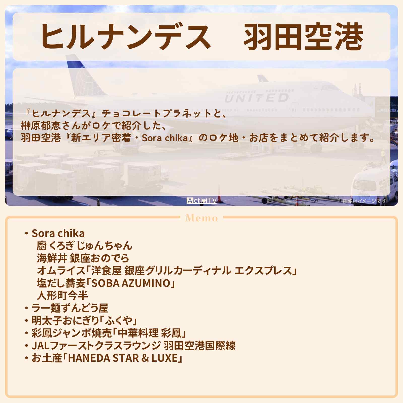 放送の【ヒルナンデス】チョコレートプラネットと、榊原郁恵さんがロケで紹介した、羽田空港『新エリア密着・Sora chika』のロケ地・お店をまとめて紹介します。