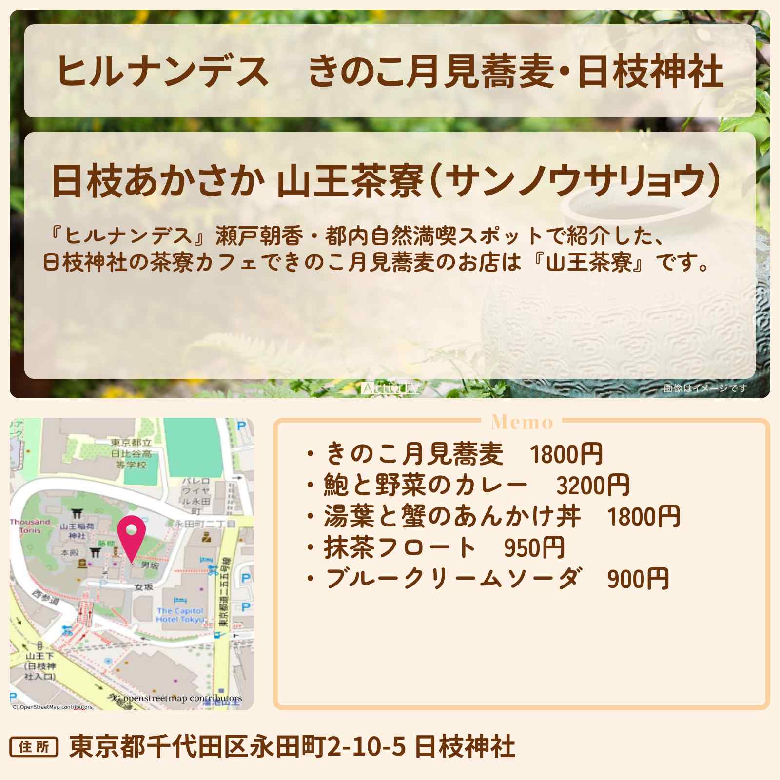放送の【ヒルナンデス】瀬戸朝香・都内自然満喫スポットで紹介した、日枝神社の茶寮カフェできのこ月見蕎麦のお店は『山王茶寮』です。