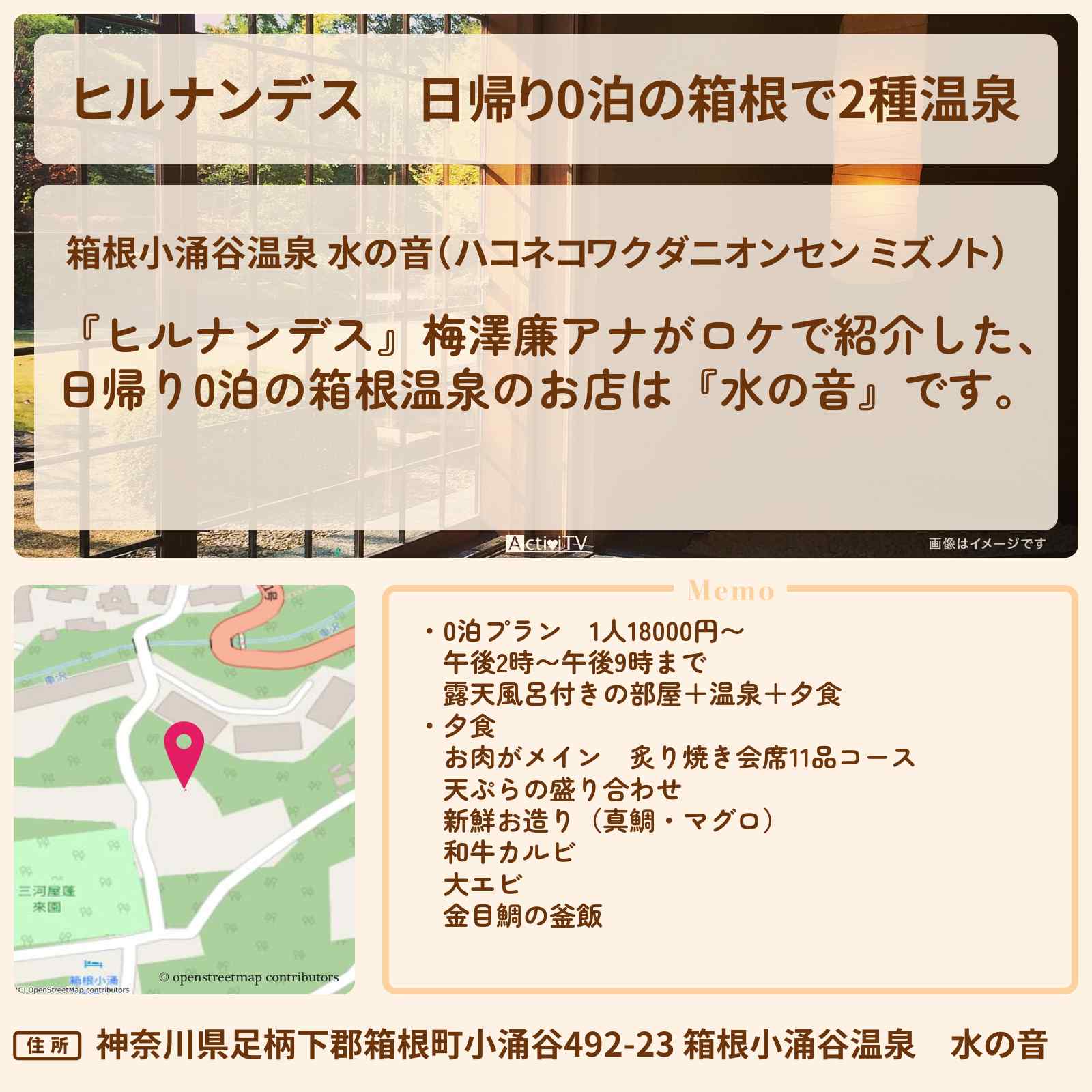 | 住所 | 神奈川県足柄下郡箱根町小涌谷492-23 箱根小涌谷温泉 水の音 |
