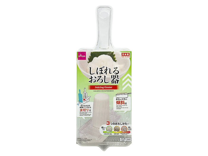 商品の大きな特徴は、すりおろした後に板をスライドさせる「しぼり」機能が備わっている点です。受け皿に傾斜があり、先端に水切り口が設けられていて、おろした大根などの汁気をおろし板をスライドさせるだけで流せる構造になっています。