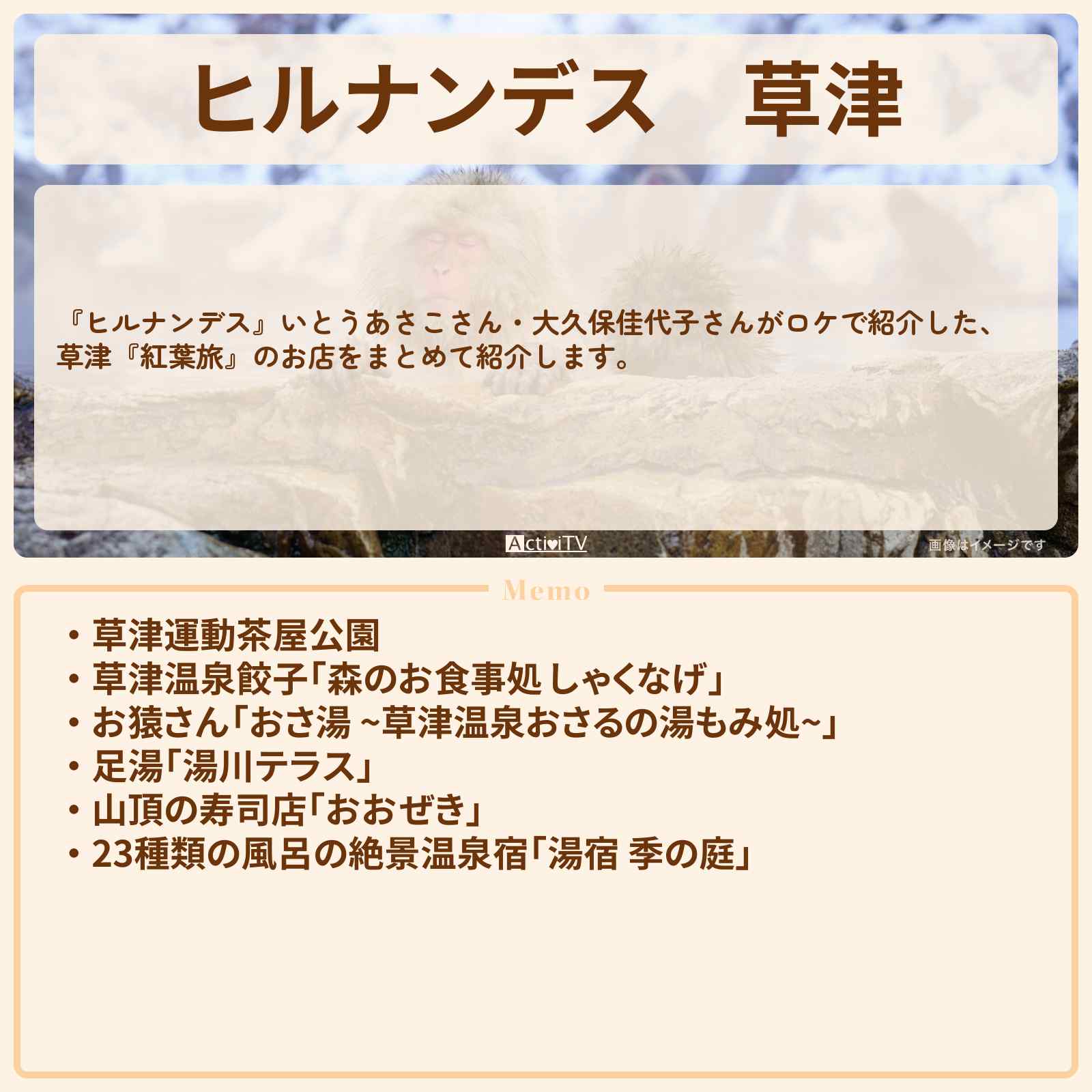 【ヒルナンデス】草津『あさこ・大久保の気まま紅葉旅』のお店・ロケ地情報まとめ〔いとうあさこ・大久保佳代子〕