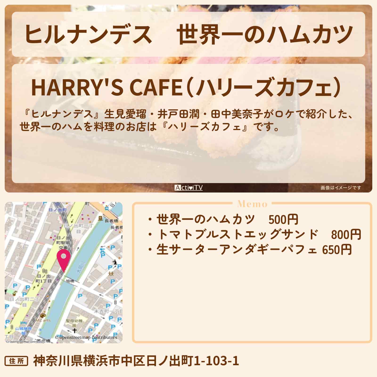 放送の【ヒルナンデス】生見愛瑠・井戸田潤・田中美奈子がロケで紹介した、世界一のハムを料理のお店は『ハリーズカフェ』です。