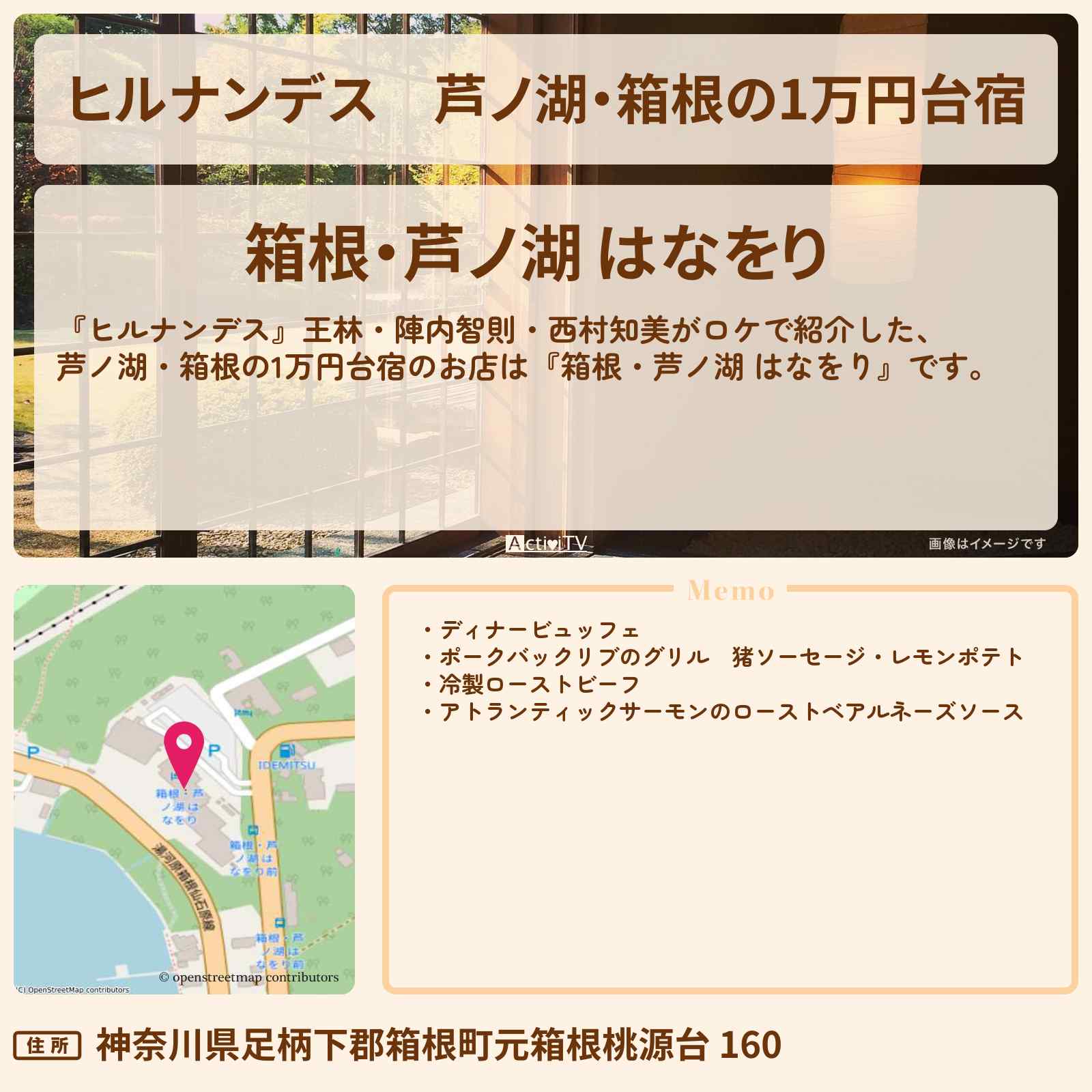 放送の【ヒルナンデス】王林・陣内智則・西村知美がロケで紹介した、芦ノ湖・箱根の1万円台宿のお店は『箱根・芦ノ湖 はなをり』です。