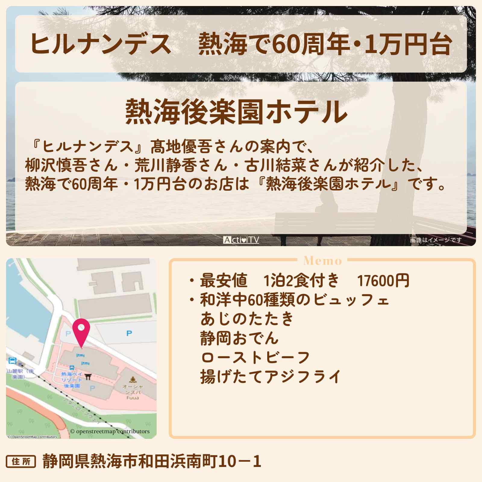 放送の【ヒルナンデス】髙地優吾さんの案内で、柳沢慎吾さん・荒川静香さん・古川結菜さんが紹介した、熱海で60周年・1万円台のお店は『熱海後楽園ホテル』です。
