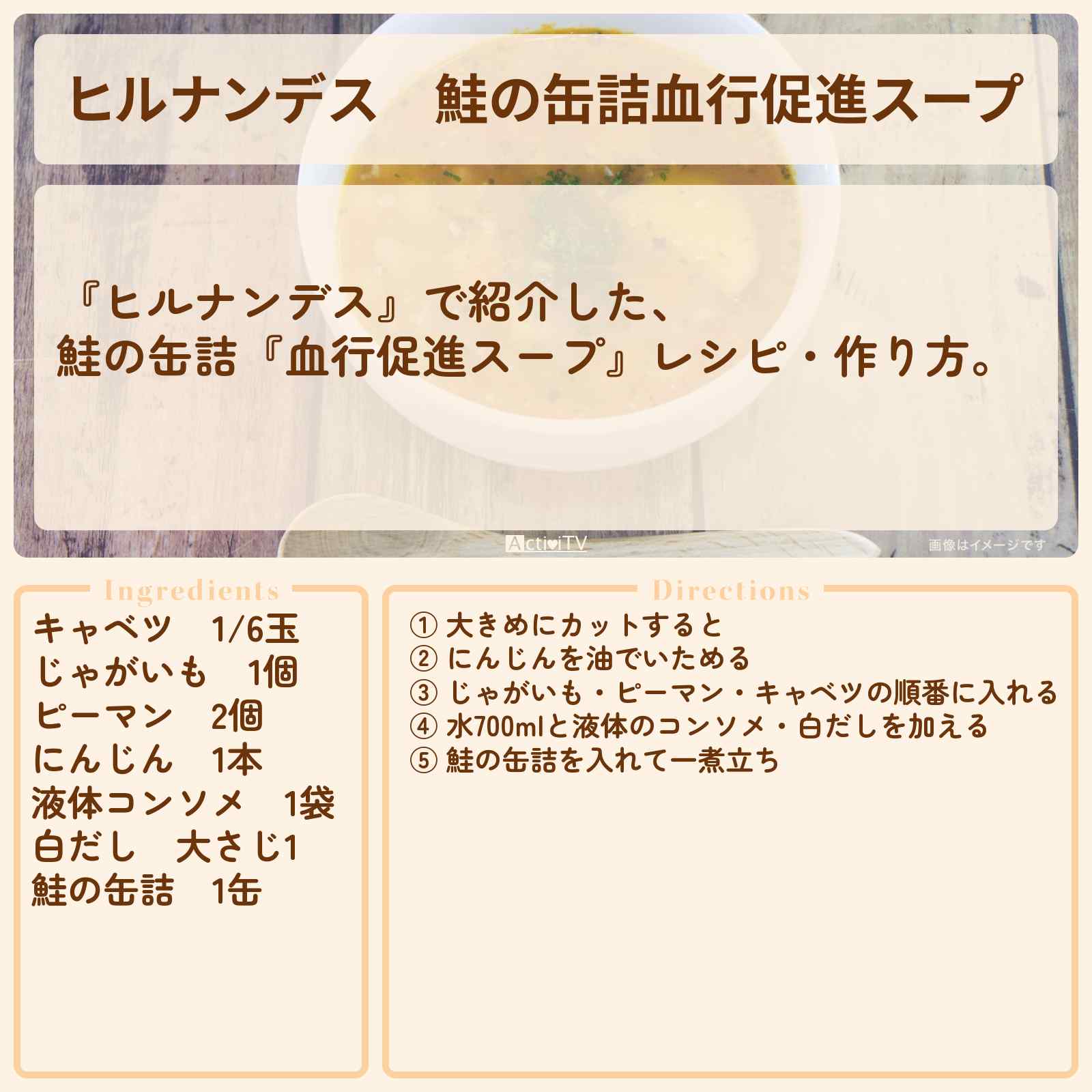 放送の【ヒルナンデス】で紹介した、鮭の缶詰『血行促進スープ』レシピ・作り方。