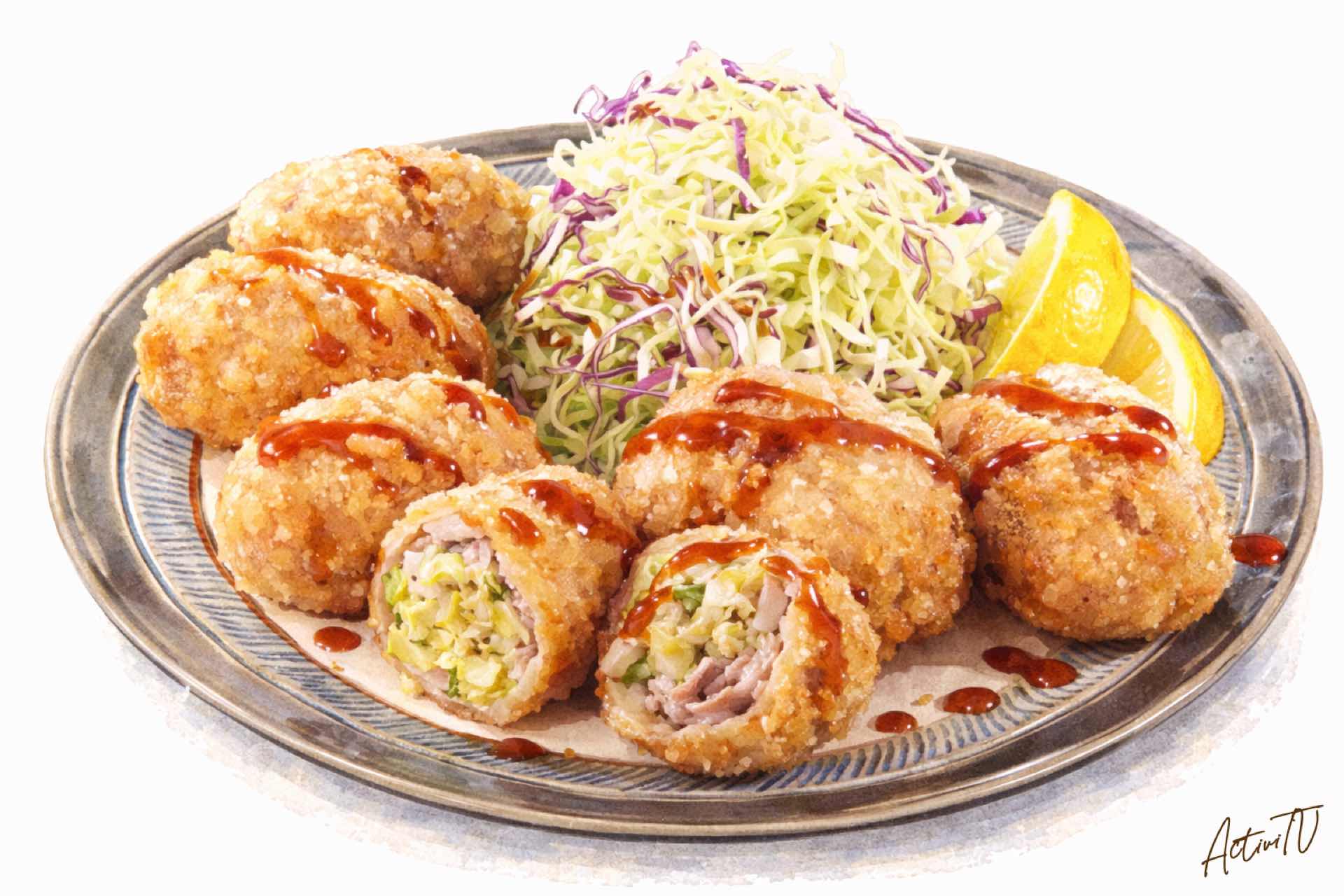 春キャベツの甘みを主役にした、軽やかで満足感のあるカツです。細切りにして一度加熱したキャベツを豚肉でやさしく包み、外はサクッと中はしっとりとした食感に仕上げます。油で揚げても重くならず、野菜をたっぷり摂れるのが魅力です。