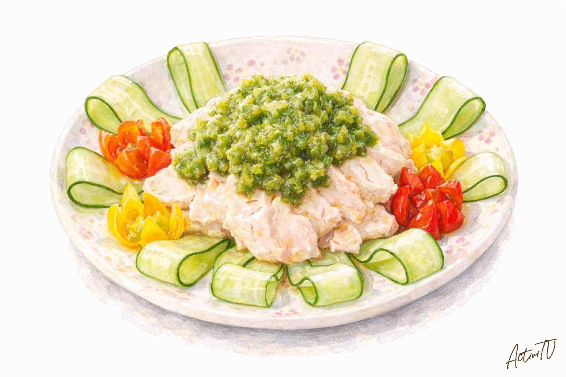 しっとりやわらかな鶏むね肉に、爽やかなきゅうりダレをたっぷりかけていただく一品です。加熱は電子レンジだけなので手軽で失敗しにくく、むね肉特有のパサつきを抑えてふわふわの食感に仕上がります。牛乳をもみ込むことで肉質がやわらぎ、調味料のなじみも良くなります。