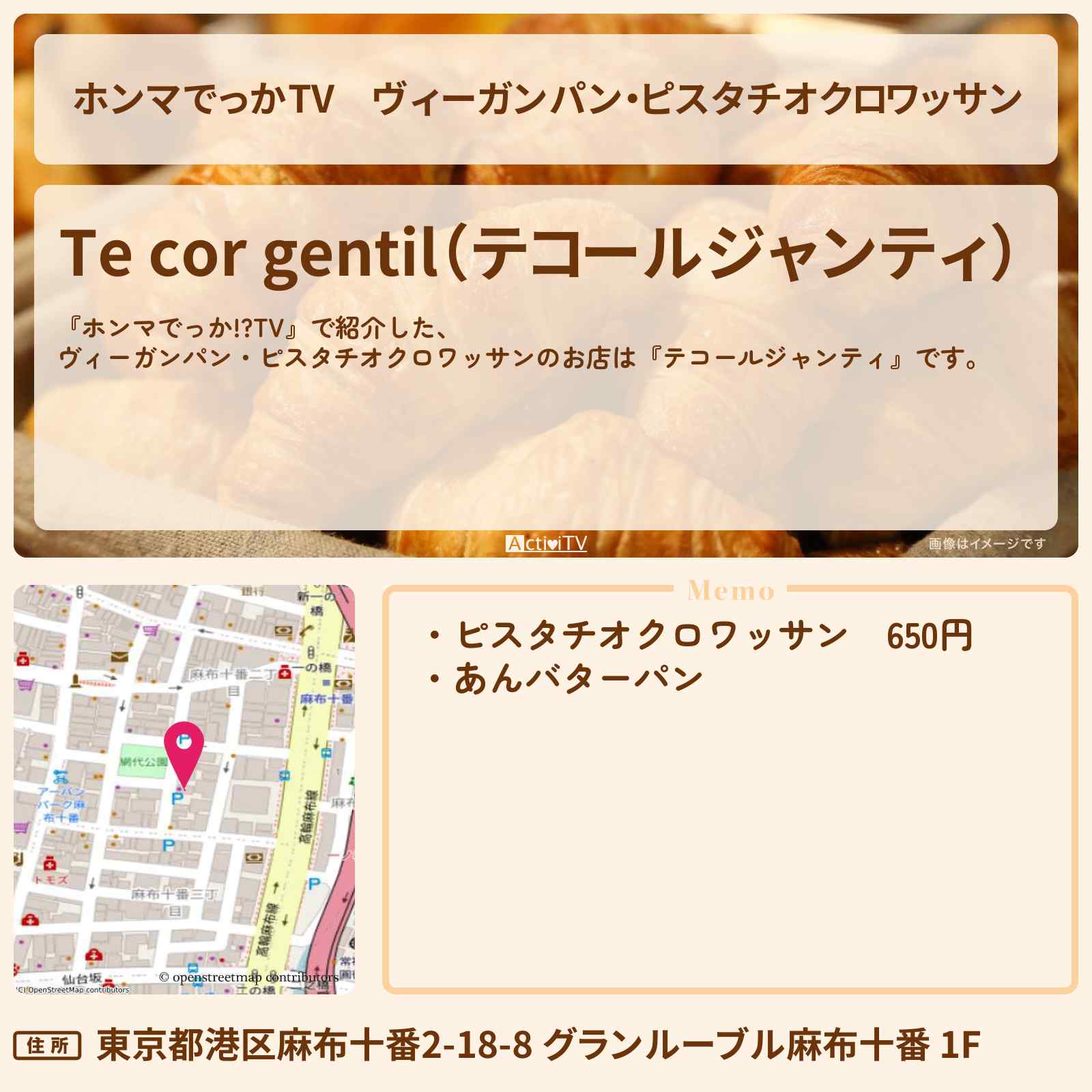 放送の【ホンマでっか!?TV】で紹介した、ヴィーガンパン・ピスタチオクロワッサンのお店は『テコールジャンティ』です。